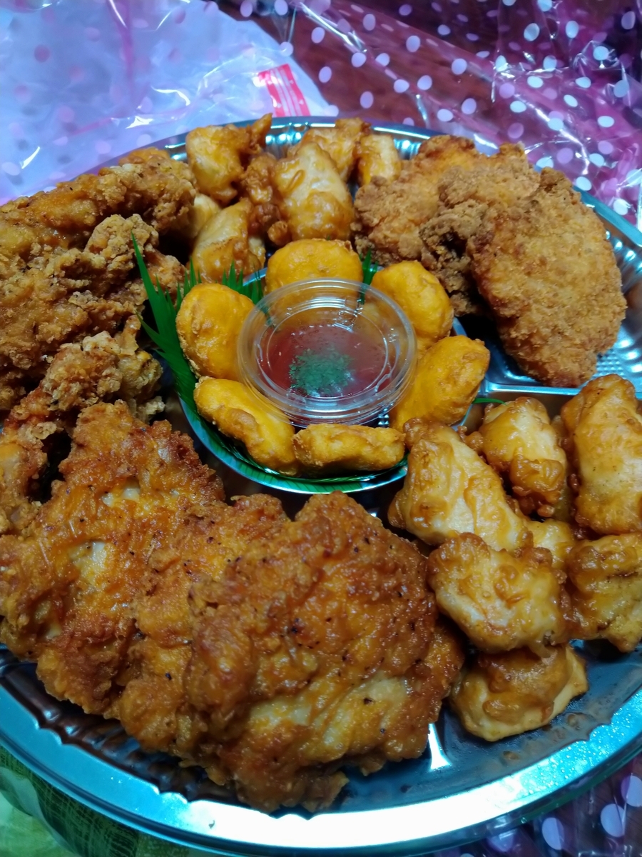 今回はオードブル(2800円)を利用。唐揚げやフライドチキン、ナゲットなどで構成された鶏料理オンリーメニューであり、安くてなかなかのボリュームなので家飲みやパーティーでよく利用されています。