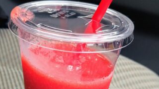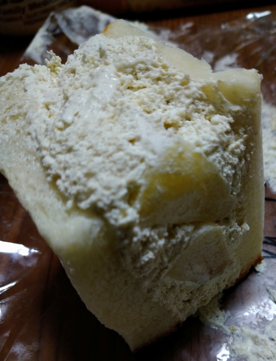 こちらがリンゴと紅茶のサンドイッチ。サイズ自体は食パンを4分の1にカットしたサイズです。その代わり厚めに切って有りクリームや具材もぎっしり入れてあります。クリーム系だとそこまで目立ちませんが、総菜系だと厚みが恐ろしいことになっています。