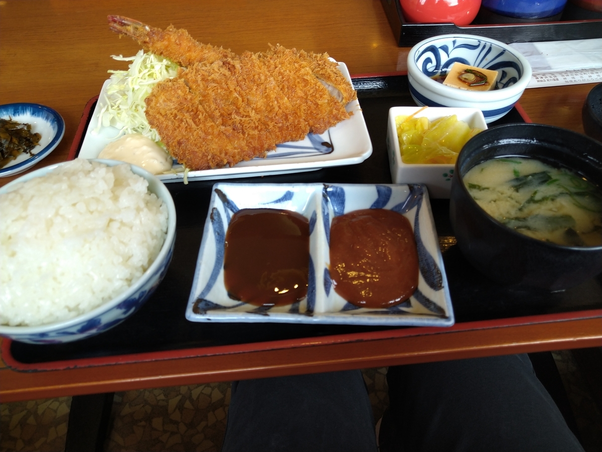 カツにエビフライ。キャベツの千切りとあり、小鉢や奴とキャベツの漬物でした。