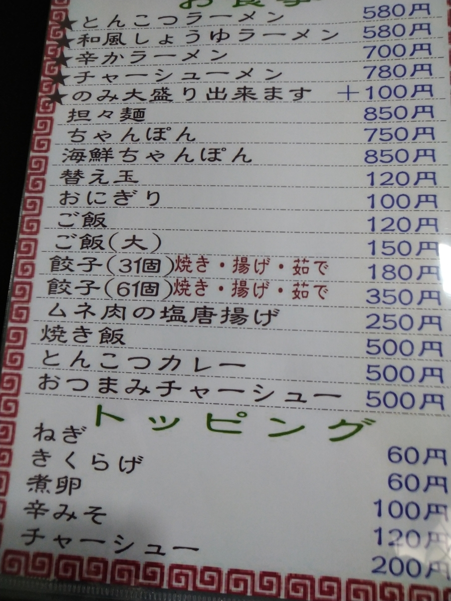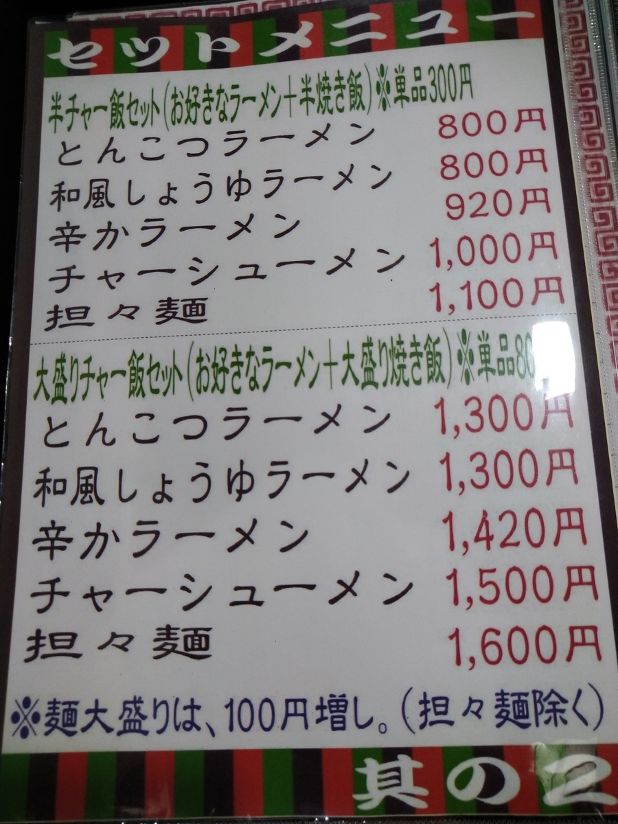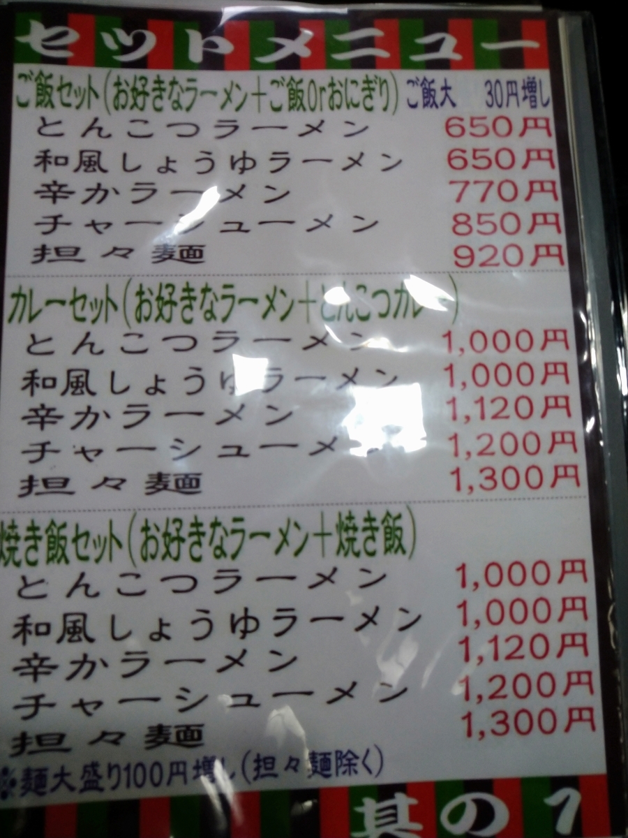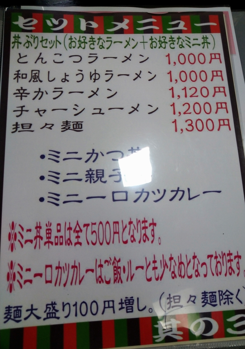 開店当初は豚骨ラーメンのみでしたが、その後醤油ラーメンや海鮮ちゃんぽんなどのそのほかの麺類も増え、サイドメニューも豚骨スープを使ったとんこつカレーやカツ丼、チャーハンなどサイドメニューもかなり充実しています。そしてセットメニューもかなり豊富に取り揃えられています。
