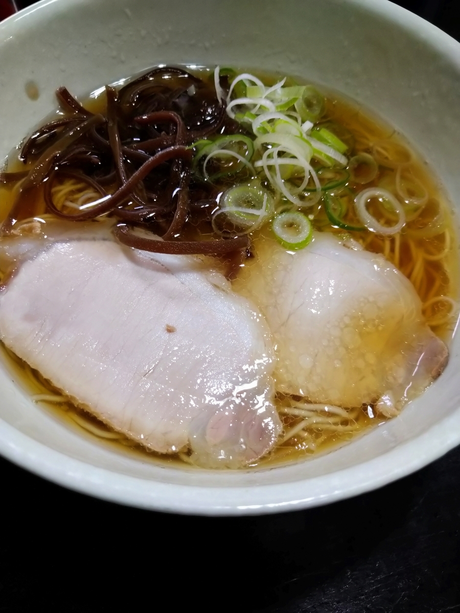 麺は極細の小麦系。あっさり系のスープならこの細さがちょうどいいのでしょう。具はキクラゲとチャーシューと刻みネギとなりますチャーシューは脂身と半々のこってり系チャーシューでした。