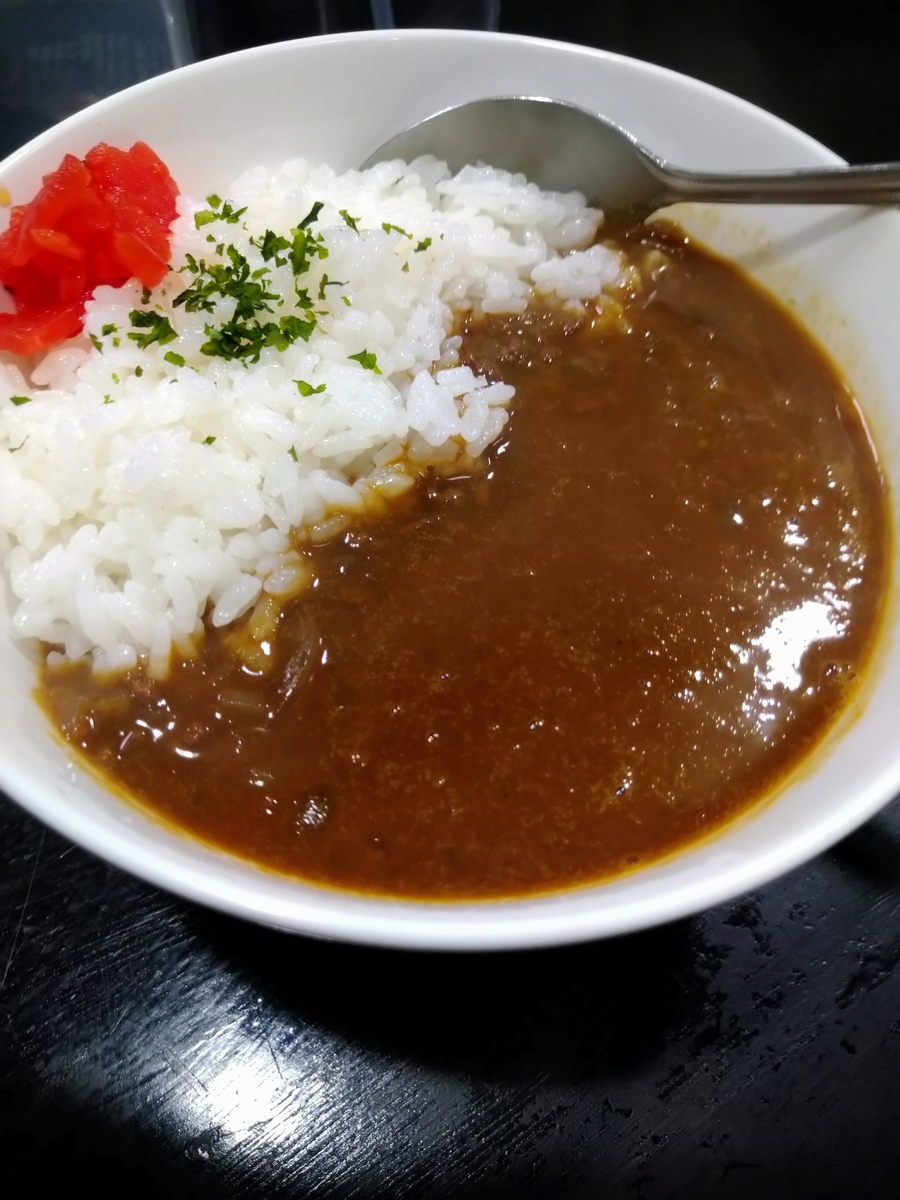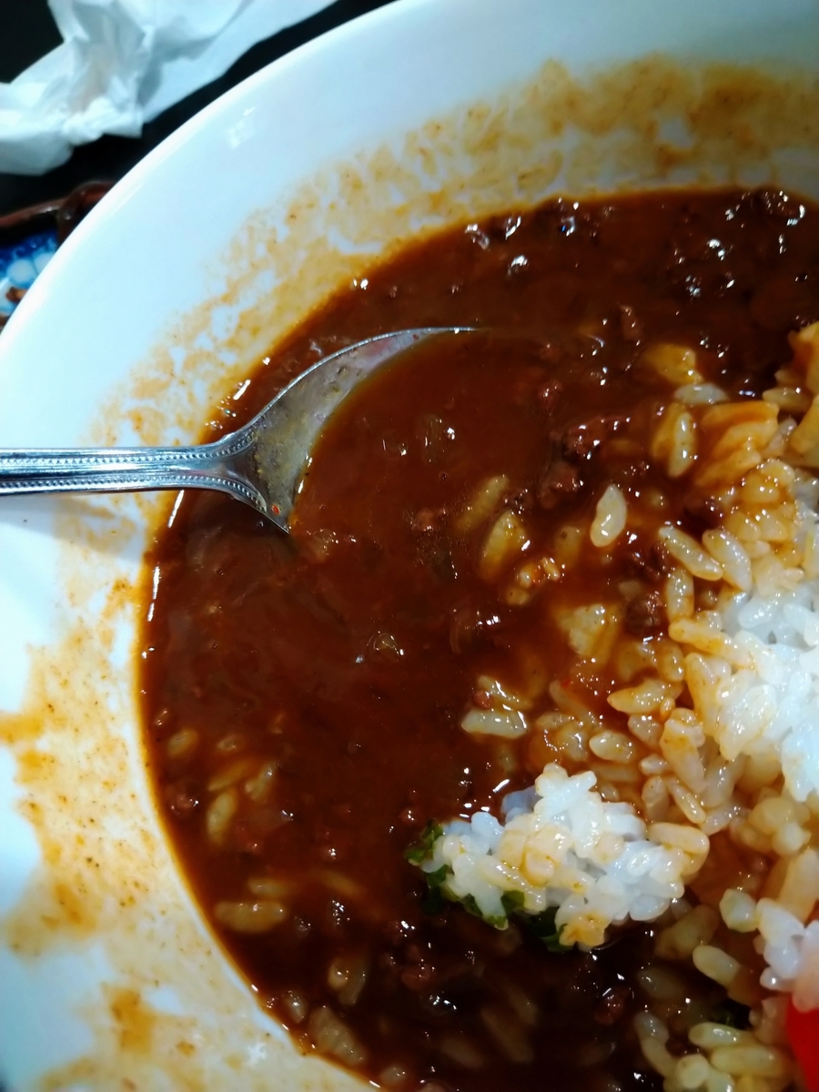ただこのカレーに対し要望があるとするなら、カレールーがさらさら系なので、柔らかいご飯だとカレーとまざると柔らかすぎてあまり食感がよくない。