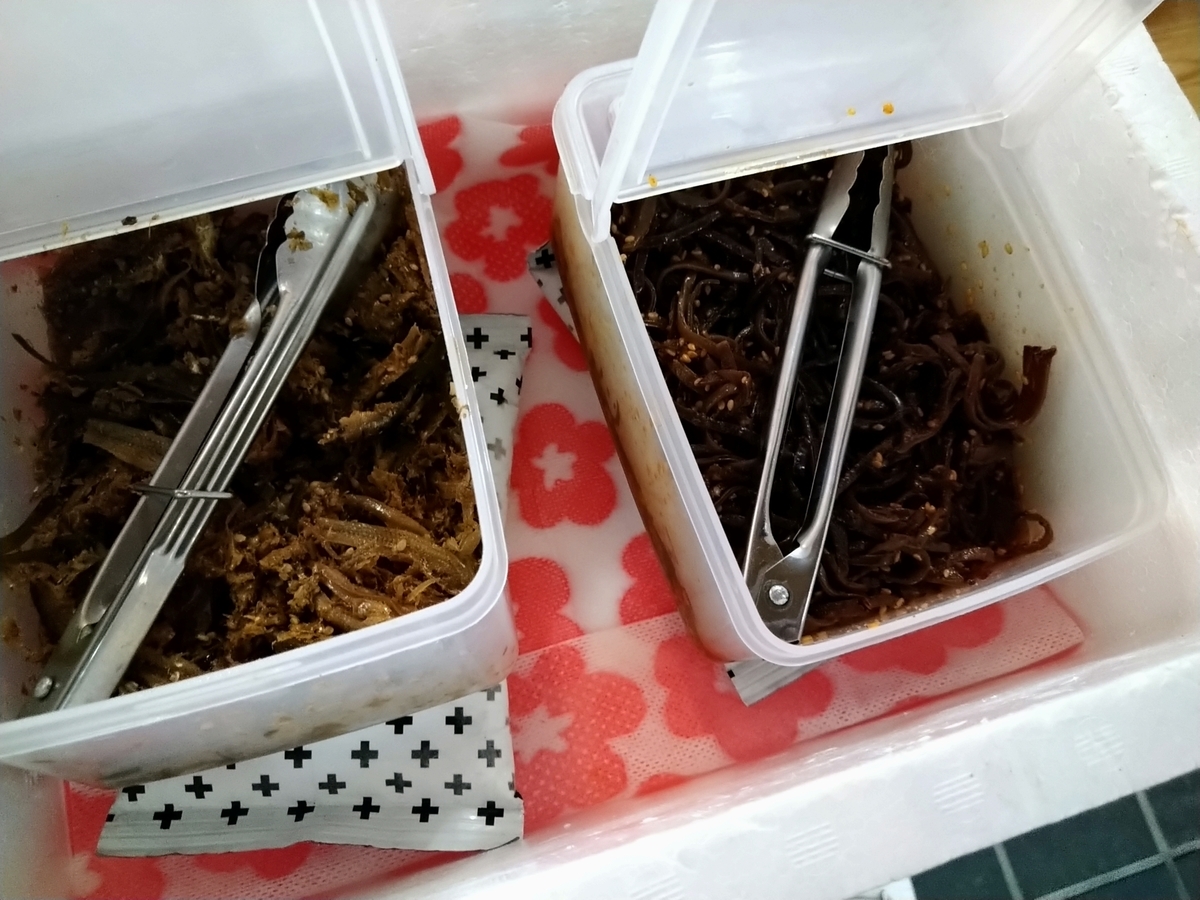 さらに味変用おかずとして無料のおかずが2種類あります。日替わりかどうかは不明ですが、この日はきくらげのピリ辛ナムルと煮干しと昆布のおかか和えでした。