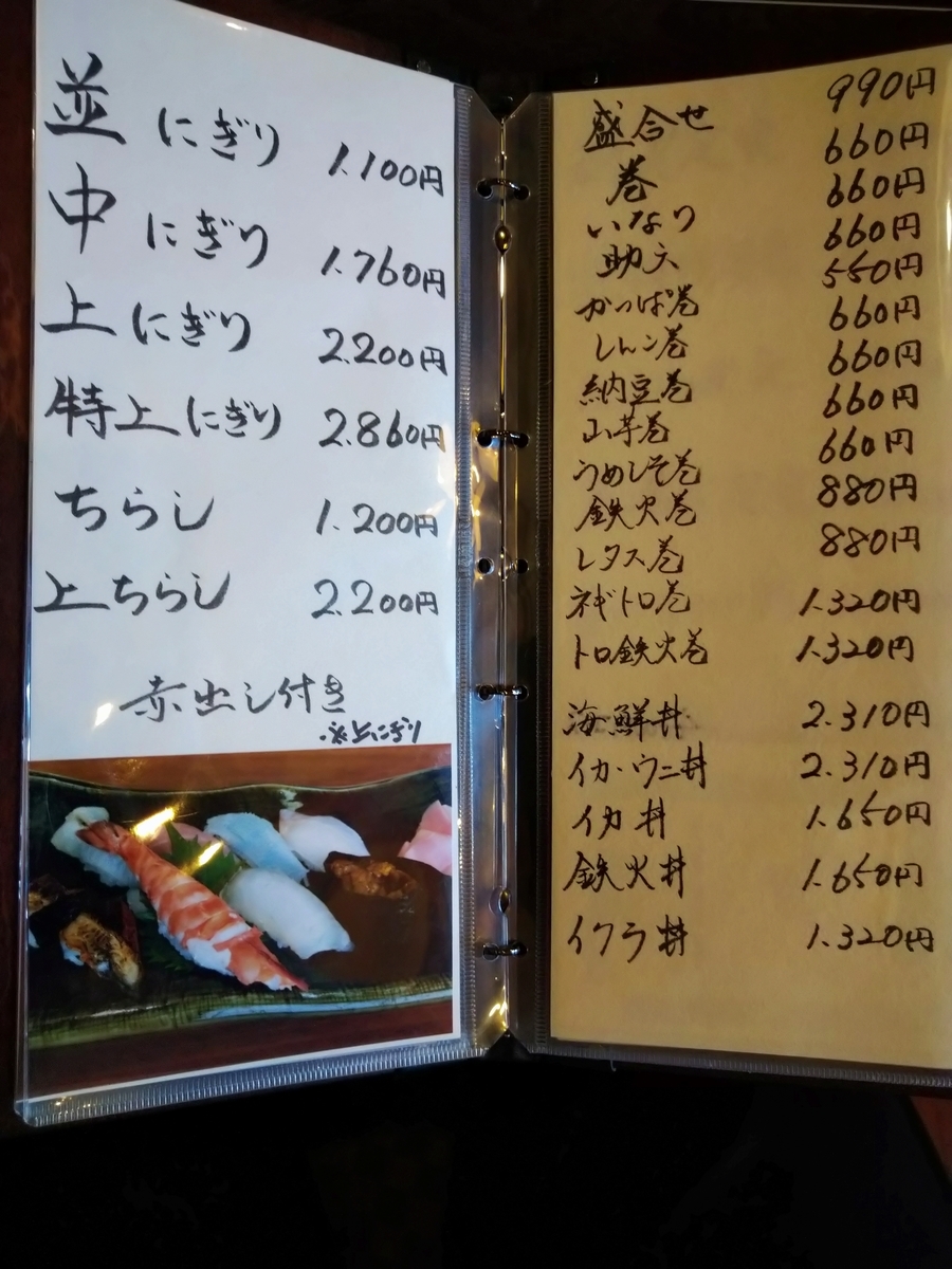 ランチメニューは寿司を中心としたAランチに海鮮丼メニューのBランチが1000円。寿司の巻数が増え、茶わん蒸し・煮つけも追加された限定ランチが2000円と、ランチメニューは3種類となっています。