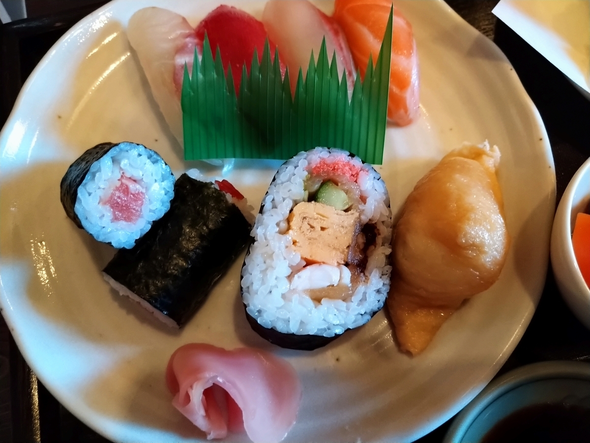今回は寿司が中心となったAランチ(1000円)を注文。内容は寿司、小鉢2つ、汁物、天ぷらです。お寿司は鉄火巻2個・助六・寿司4巻です。