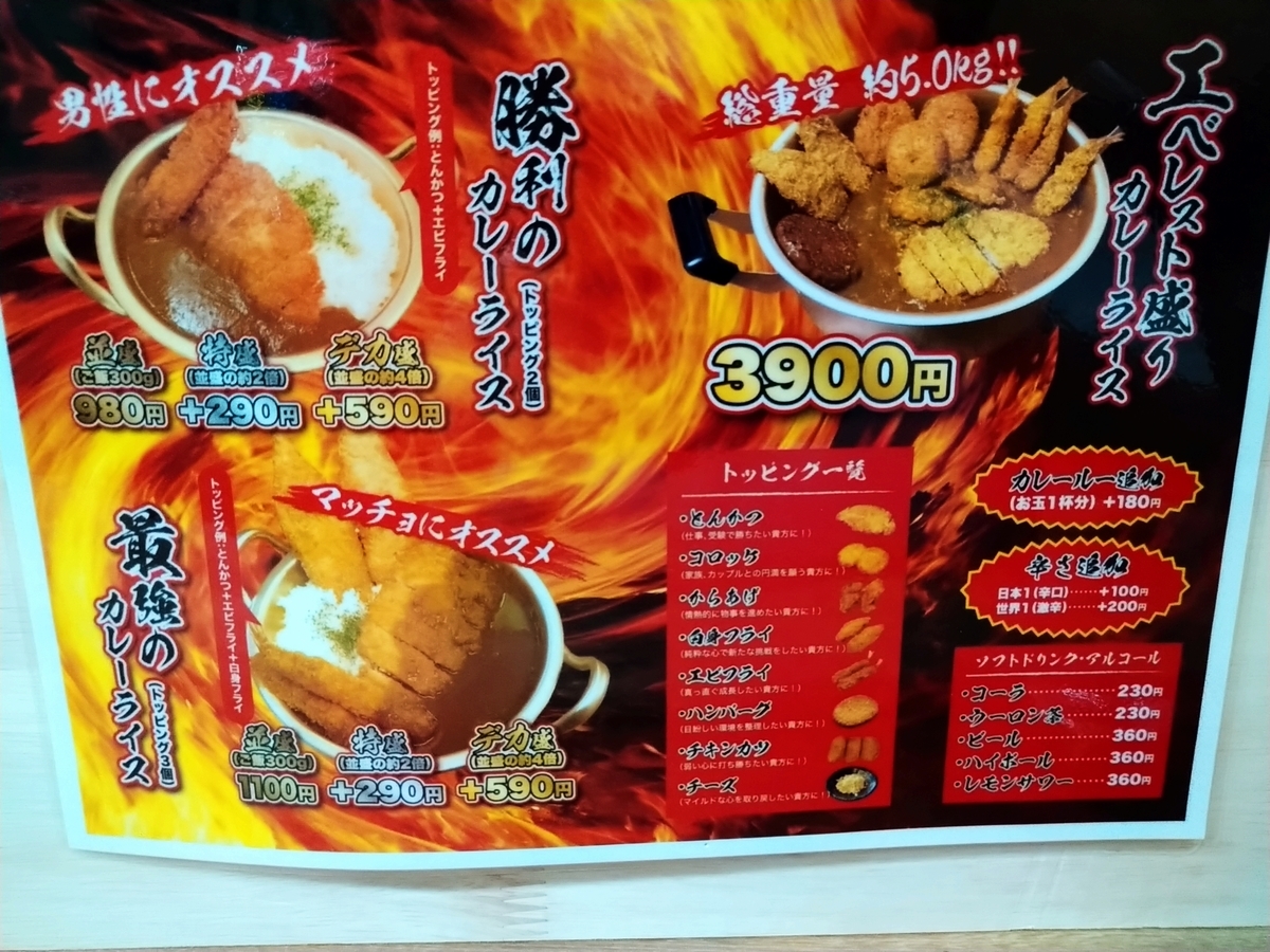 カレーはトッピング無しが690円ですが、並盛りでもご飯は300グラムとかなり多め。特盛は並盛の2倍のボリュームで+290円。デカ盛りは並盛の4倍になり+590円となっています。