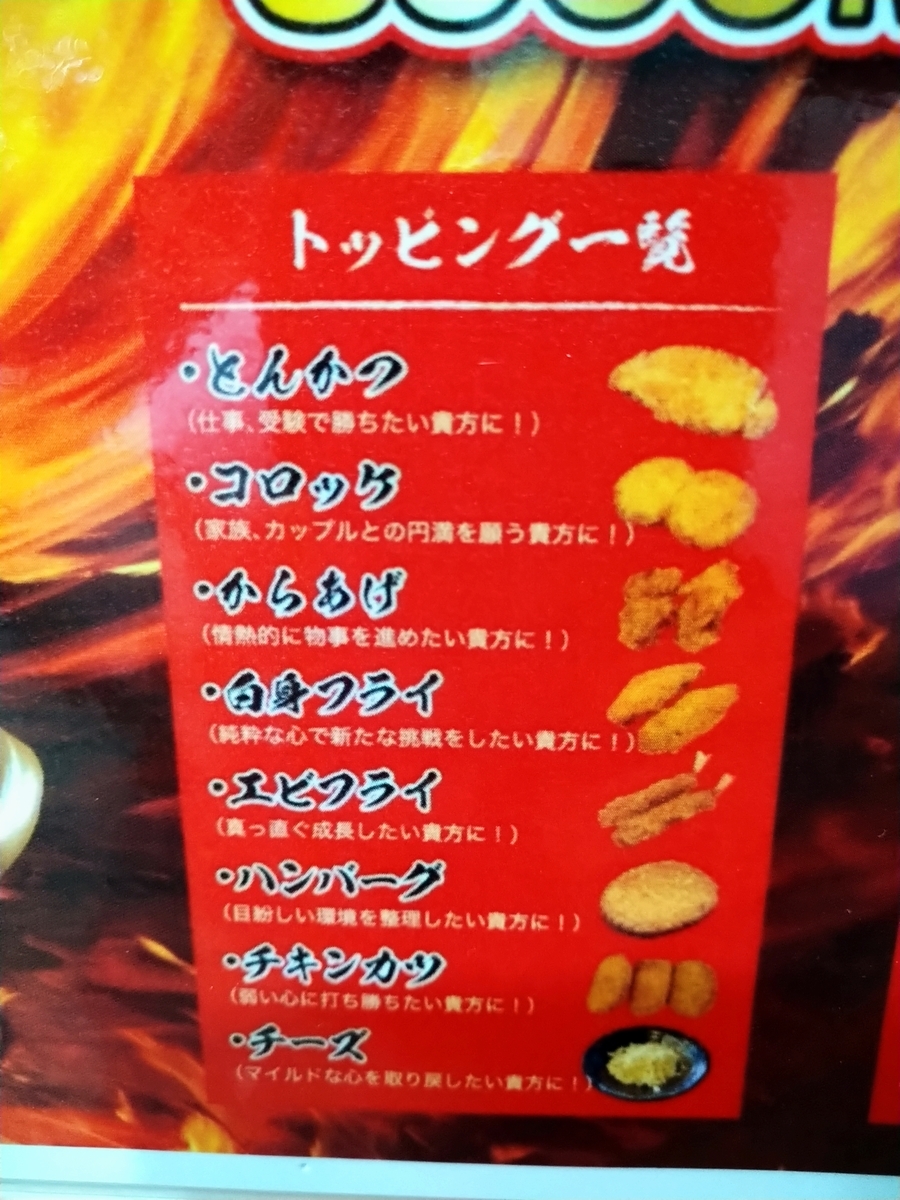 トッピングひとつが並盛840円。トッピング二塚並盛980円。トッピング三つが並盛1100円となっています。トッピングの種類はとんかつやから揚げといった揚げ物から、ハンバーグ・チーズといったものがあります。