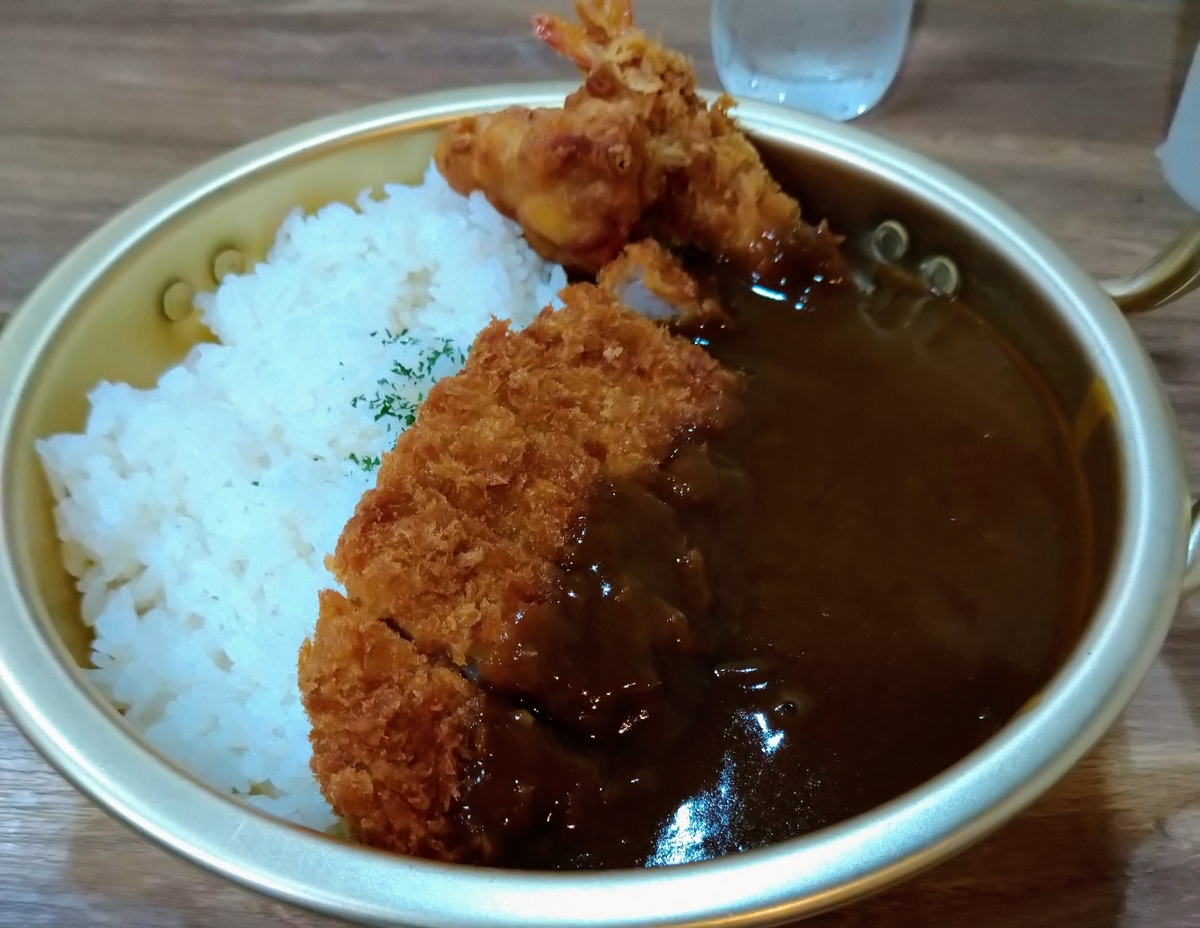 今回は唐津しかかたんを注文。とんかつ一枚に唐揚げ一つ、エビフライ一本。チーズにご飯が300グラムとかなりの大ボリュームのメニューとなっています 。ちなみに揚げ物は注文してから揚げるためカレーとしては提供に時間がかかってます。どうも店長のワンオペ状態なのでしかたないかもしれませんが。