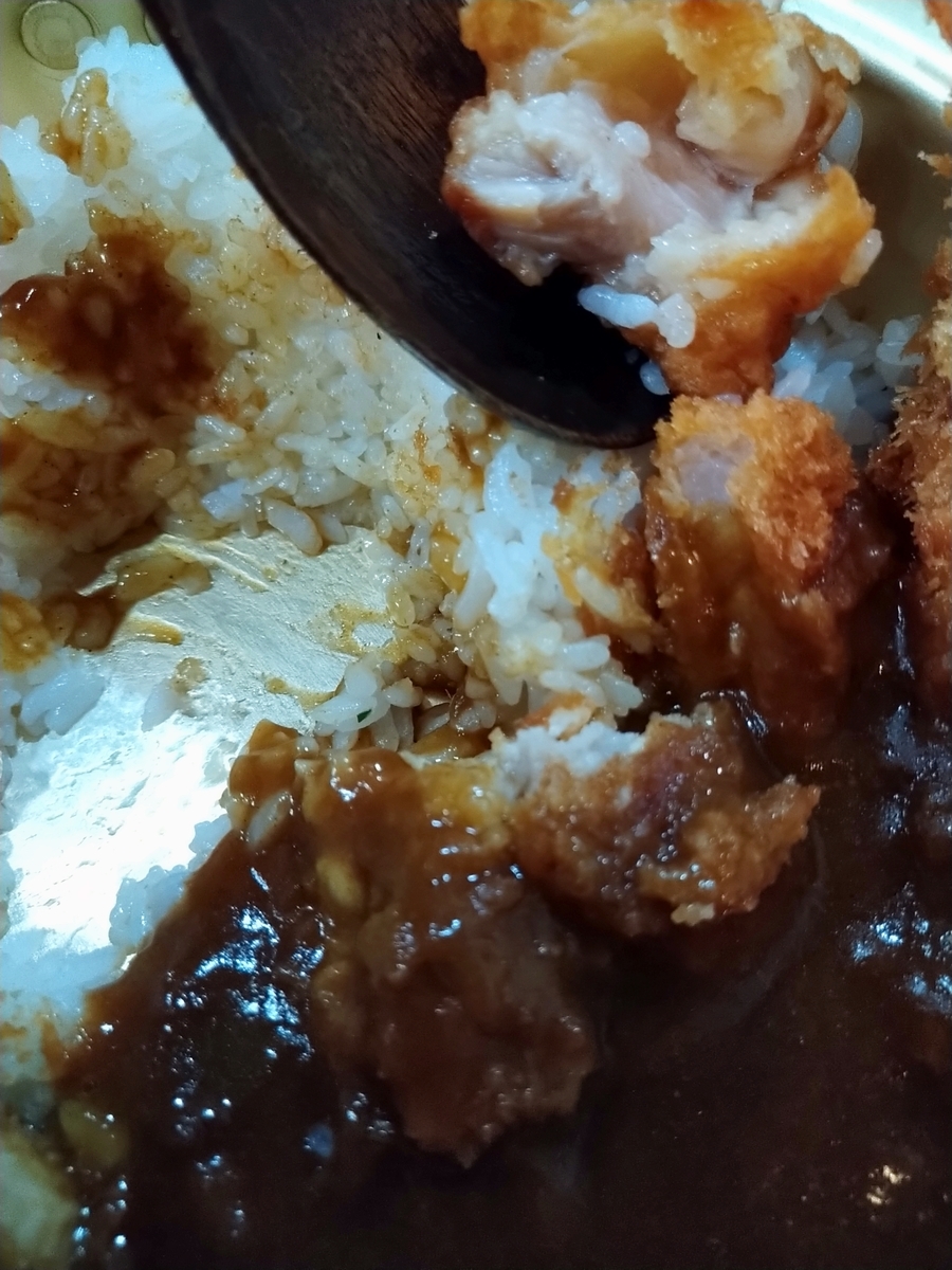最近は甘い系のカレーが多かったのでなんだかなつかしい。使ってある肉が鶏肉であるため、豚や牛のような脂から甘みが出るタイプでないのも甘さが少ない理由の一つだと思われます。
