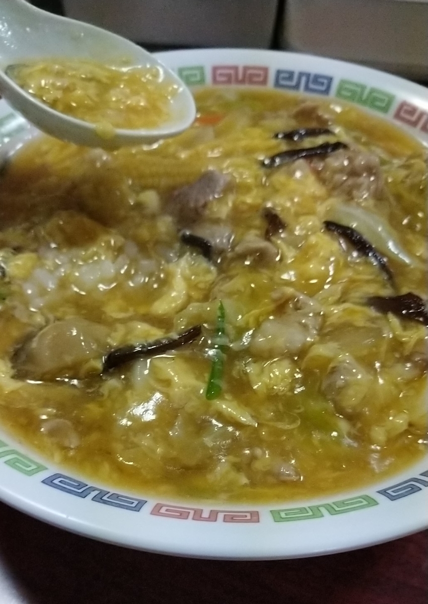 今回は中華丼(750円)を注文。浅く広いタイプの器に入っており、溶き卵でふわふわの層を作ってあります。