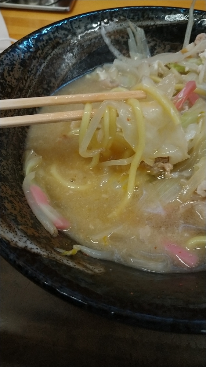 麺は伸縮性がある中太ちゃんぽん麺。下から引っ張り出そうとするとびよーんと伸びます。ですがコシがあるというタイプではなく、思いのほか麺一本一本が短い。伸縮性があるせいで野菜と絡まり取り出しにくくて食べづらかった。味はよかったんですが・・・・