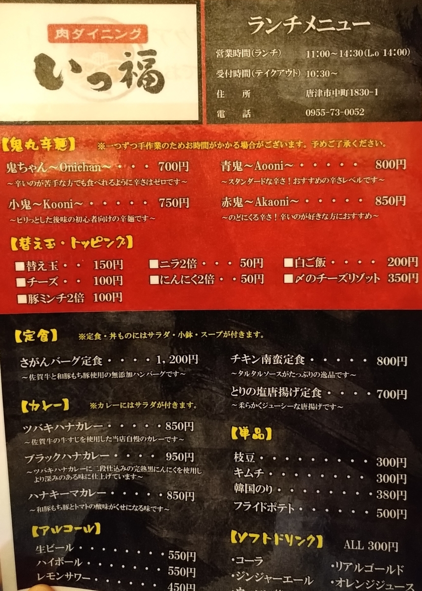 メニューはハンバーグ・唐揚げ・チキン南蛮と肉料理を中心とした定食メニューに加え、以前中町にあった辛麺専門店の鬼丸や、カレーグランプリで優勝した華つばきの系列店であるため、辛麺や華つばきカレーも提供されています。