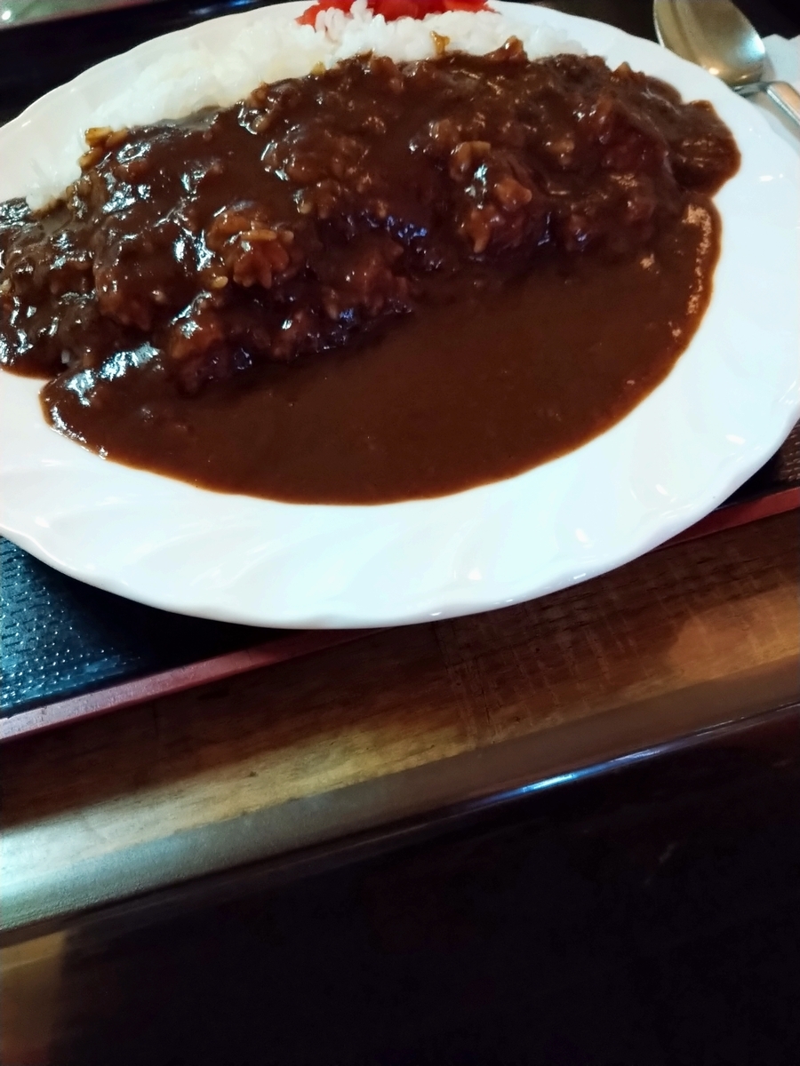 カレーは610円とリーズナブルながら、かなりのボリューム。皿の直径がスプーンの長さ以上になるくらいです。カツに隠れてますが、ご飯もガッツリ入っています。