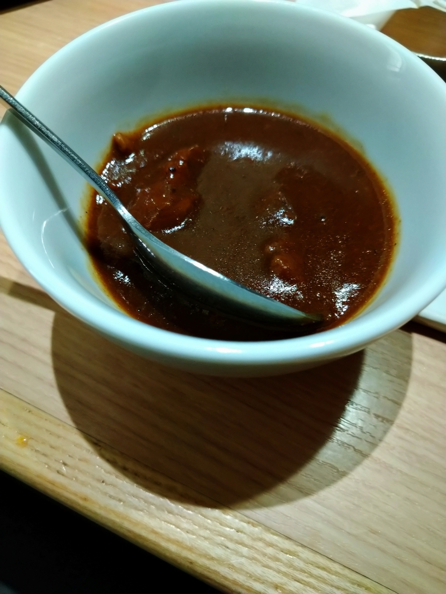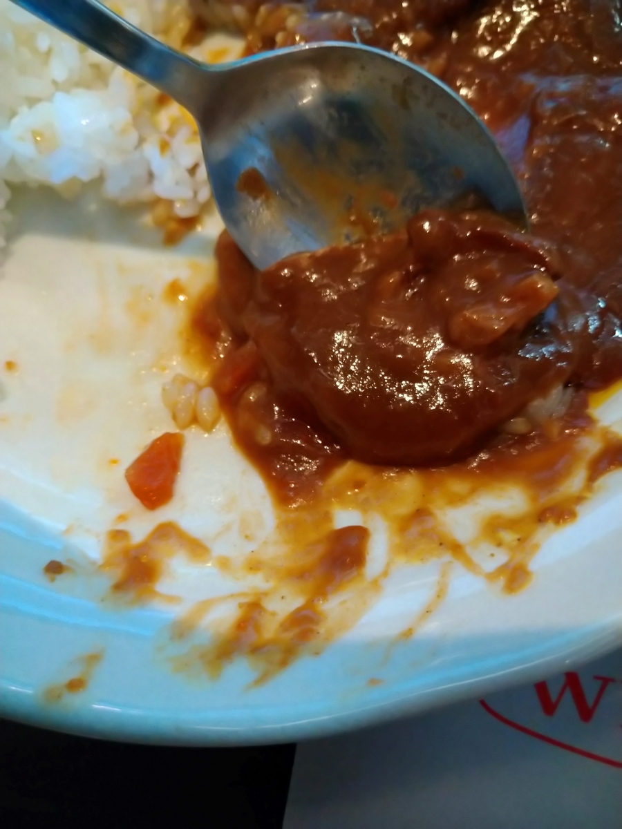 カレーは結構スパイシー。食べているとお腹の中から熱くなってくる、スパイスがしっかりきいた辛口です。味自体はご飯が進むタイプのカレールー。しっかり味で様々な具材が溶け込んでおり、レトルトでは味わえない複雑なうまみがありました。ちなみに具材はほとんど入ってないです。煮込みまくって溶け込んでるそうです。名物として親しまれるのがうなづけるおいしさです。