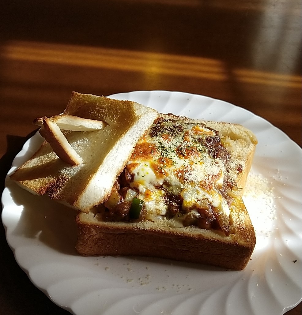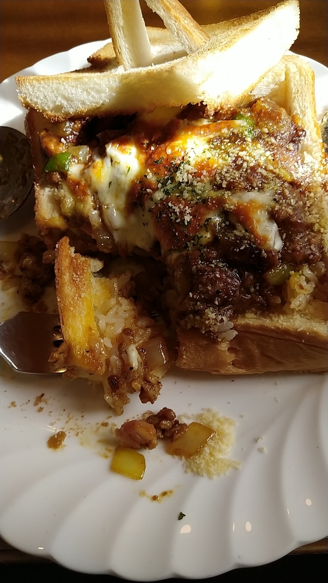 その中でも名物がカレードリア。こちらのカレードリアの特徴は中をくりぬいた食パンの中にカレードリアが盛ってあること。液体系のカレーでは漏れでてしまうため、ひき肉たっぷりのキーマカレーが使われています。