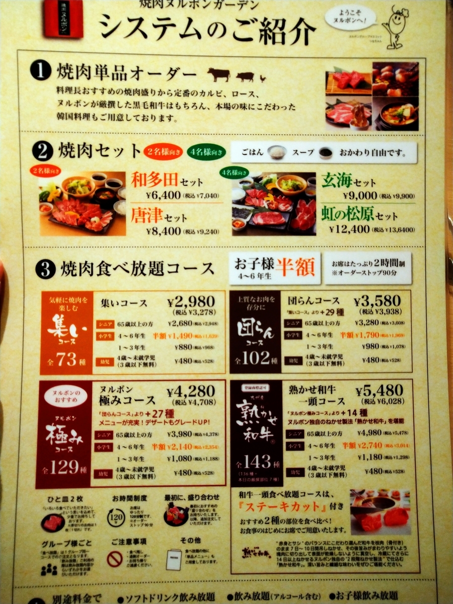 メニューは食べ放題が中心。一番安いのが73種類の集いコース。102種類で国産カルビや上ホルモン、焼きすき、石焼ビビンバなどが追加された3938円の団らんコース。129品でブランド豚・鶏や牛タンや海鮮類が増える極みコース。シェフお勧めの部位やステーキカットサービスに加え、肉巻き寿司などの一品料理が増える136種の熟かせ和牛一頭コースが6028円となります。