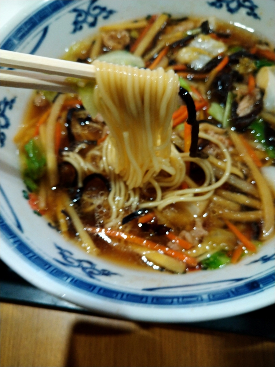 まずは五目ラーメンから。スープは醤油風味。しょうがを効かせたあっさり系で、中華料理系のラーメンなのでもっと濃いかと思ったら飲みやすいさらさら系です。具材もタケノコ・にんじん・白菜・キャベツ・きくらげ・豚肉と野菜たっぷりで具材も豊富。