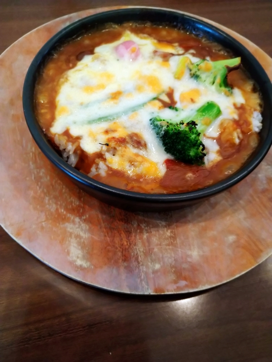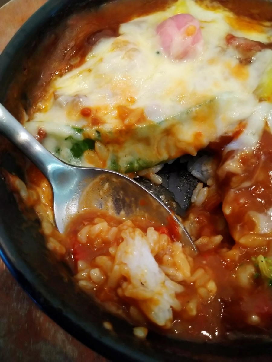 まずはカレーの味から。カレーは甘口。焼きカレーの多くはあまり辛さを感じないものが多く、これも甘口系でした。そして結構な酸味が効いており、刻んだトマトがカレーに混ぜてあるため、これが酸味の一因になっているようです。