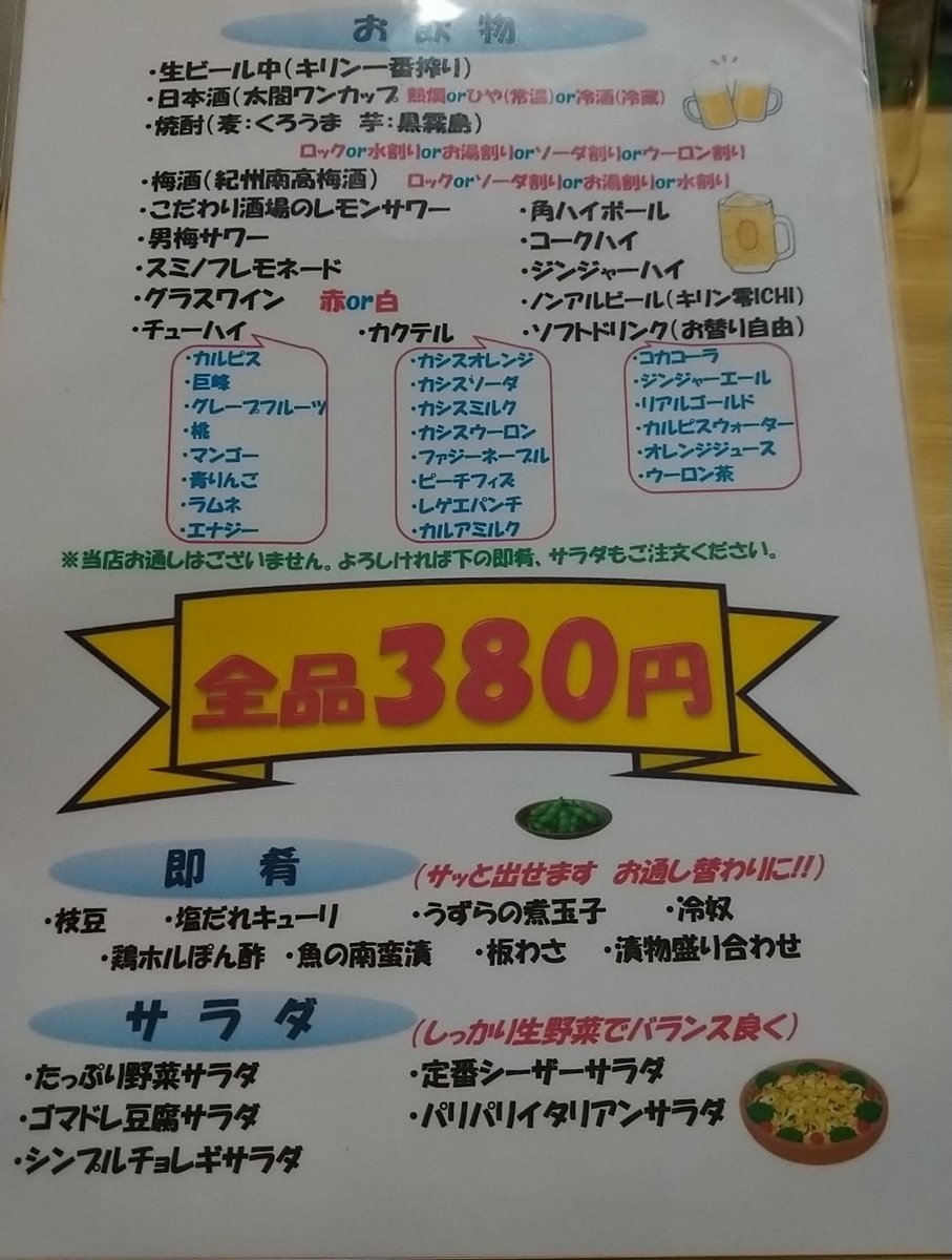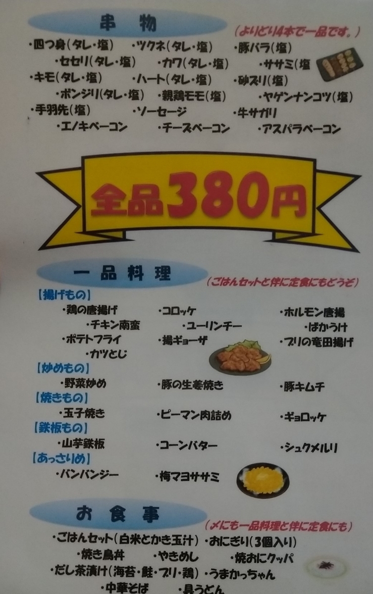 夜のメニューは一品料理・ドリンク・お酒すべてが380円の居酒屋メニューのみとなっています。居酒屋メニューは4本セットで好きな肉を頼む焼き鳥や唐揚げ・ユーリンチー、ホルモン唐揚げといった揚げ物。卵焼きや野菜炒め、豚キムチといった焼き・炒め系。サラダや漬物セットといった野菜類。さらに焼きめしやお茶漬けなどもあり、これらがすべて380円です。量も一人前のため、種類を食べたい人や一人飲みにもおすすめです。