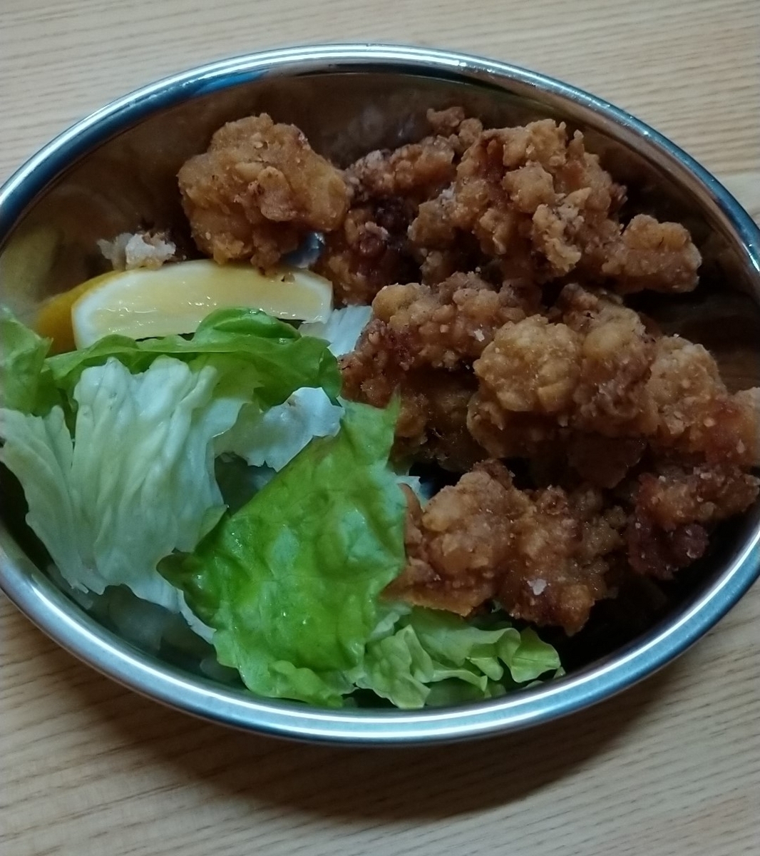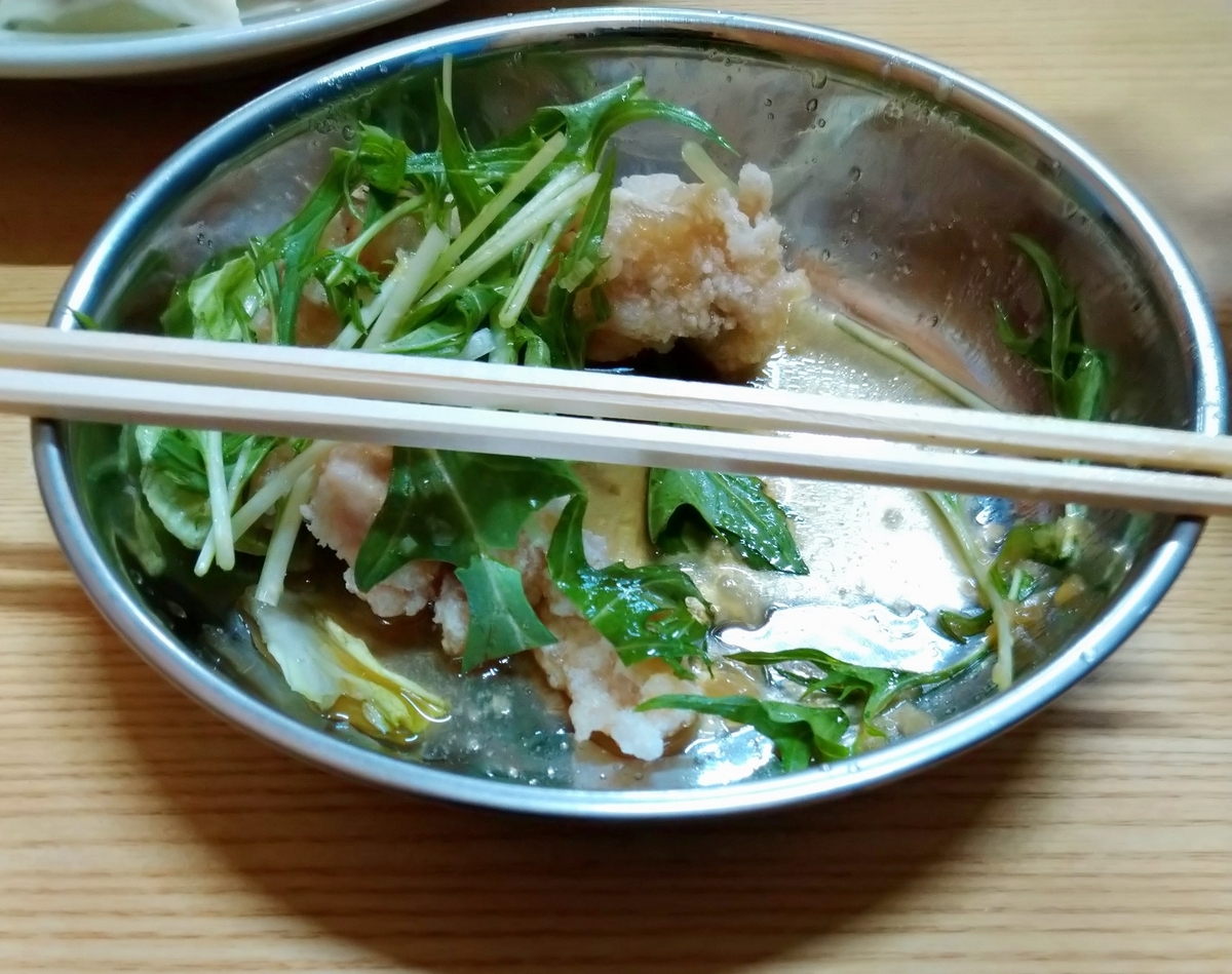 つぎはホルモン唐揚げ。ホルモン天ぷらは釣り天狗やひとすじでもありますが、唐揚げのほうは珍しい。味としては衣に濃いめの味付けがしてあり、ホルモン自体は薄味です。一口サイズのためホルモンの硬さはそこまで気になりません。これは結構濃いめの味付けなので、おつまみ向けのメニューです。