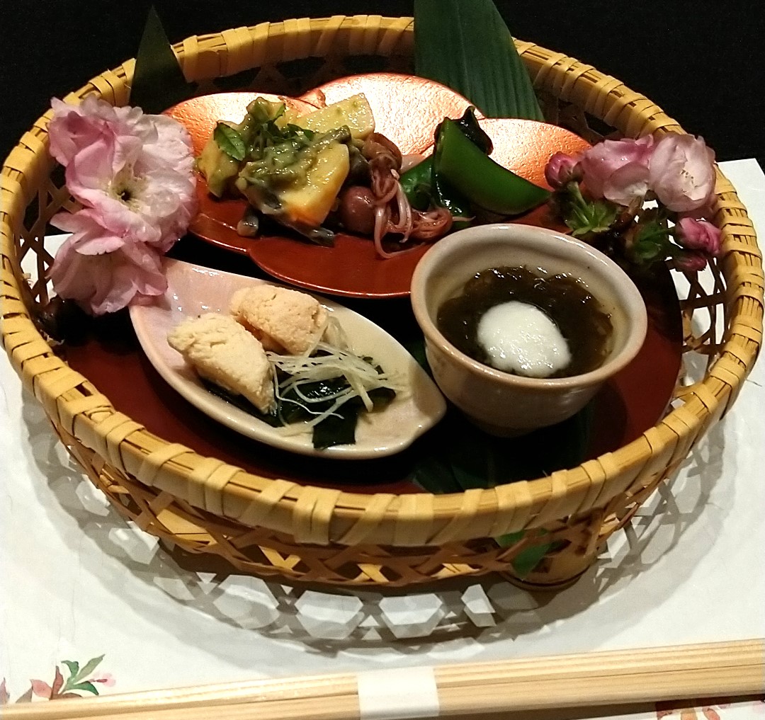 まずは前菜。ホタルイカ・タケノコの和え物。タイの子旨煮。もずくとろろかけ。スナップエンドウの黒ゴマクリーム掛け。前菜でタイの子って珍しい・・・