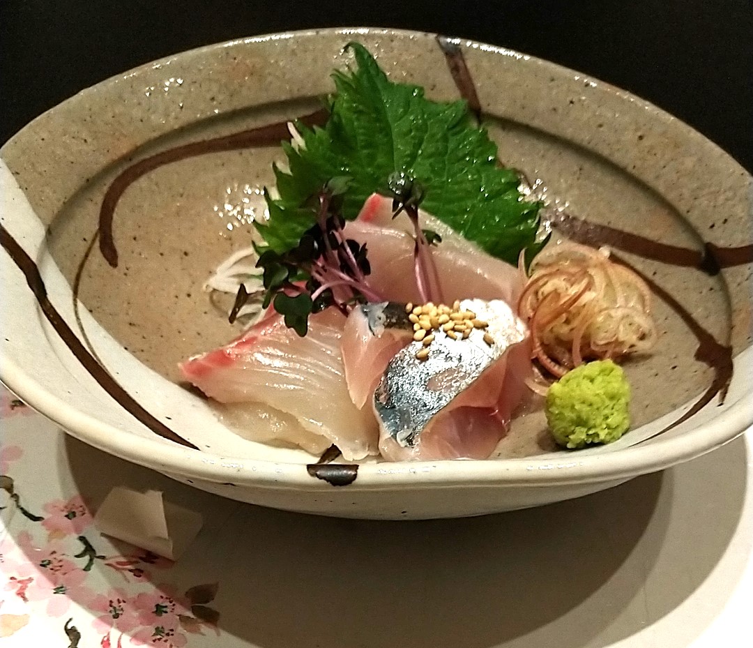 お造りは鯵・タイ・かんぱちの3種類。わさびの他にみょうががそえてあります。刺し身でみょうがが添えられているのは珍しい。そしてこのみょうががわさびとは違うアクセントがあり、刺身との相性が抜群です。
