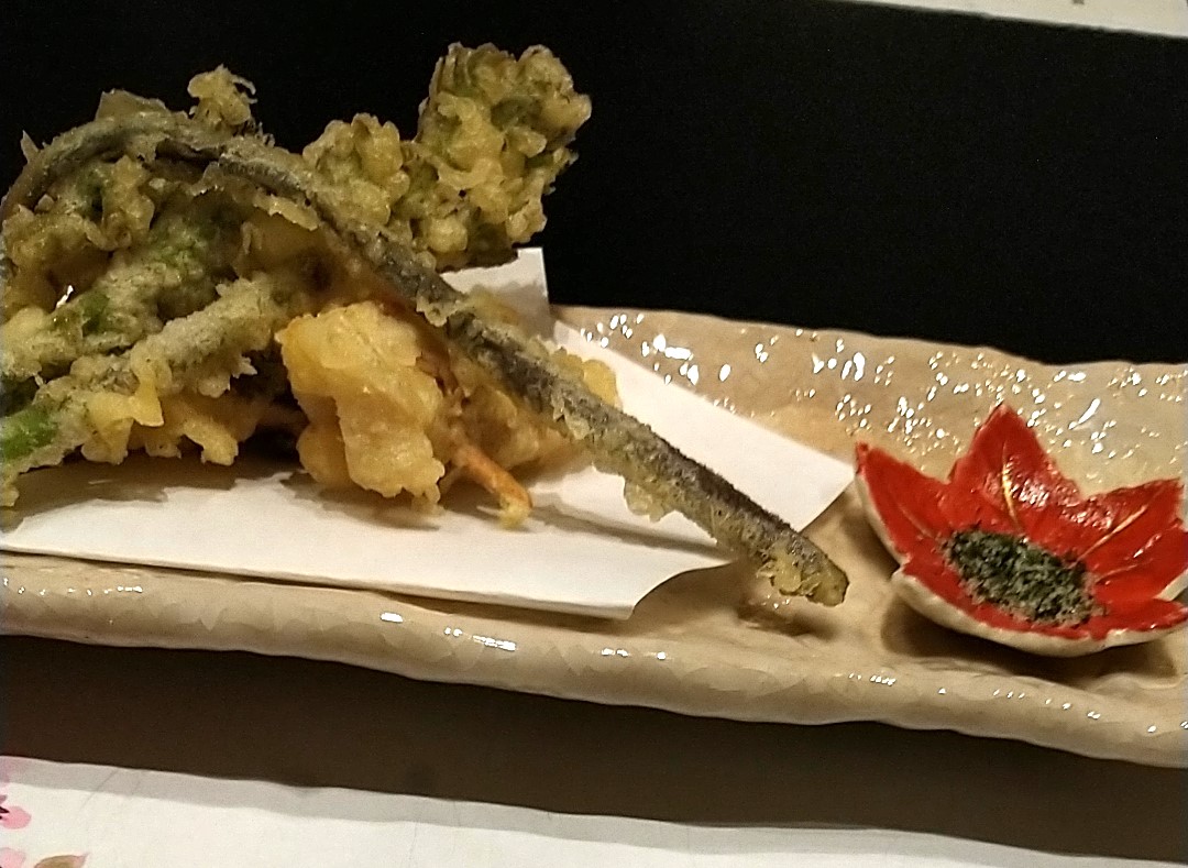 こちらは桜鯛と春野菜の天ぷら。春野菜はゼンマイ、タラの芽、しいたけの三種類。桜鯛は梅肉を包んであり、磯辺塩でいただきます。