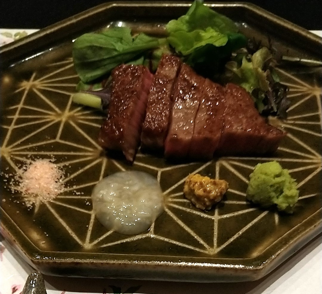 今回一番わかりやすいメニューである佐賀牛のステーキ。岩塩・塩こうじ・マスタード・わさび・ジャポネソースの5種類で楽しみます。塩こうじで肉を味わうのは初めてです。漬け込んで柔らかくすることはあっても調味料にしたことはない。