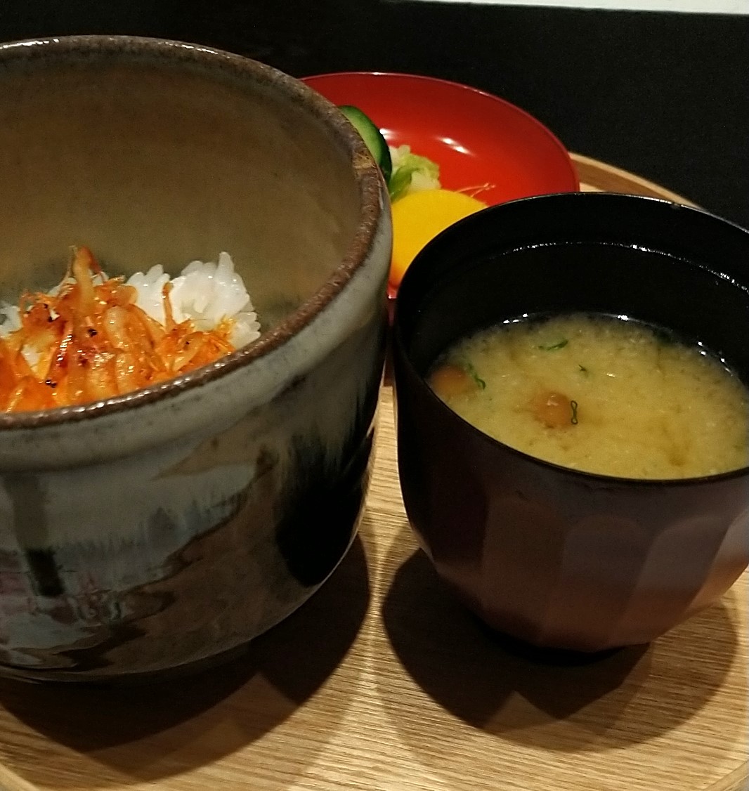 こちらは桜えびごはん・なめこ汁・漬物。見た当初は桜エビだけはさすがに物足りないのでは・・・?と不安に思いましたが、口に含むと桜エビの強い香り、そして塩味がご飯を進めてくれます。漬物もおいしいし、何よりこのなめこ汁。だしがしっかりときいており、味噌が強すぎない。まさに二日酔いのときにこれが出てきたらうれしいなぁ・・・という優しい味噌汁でした。