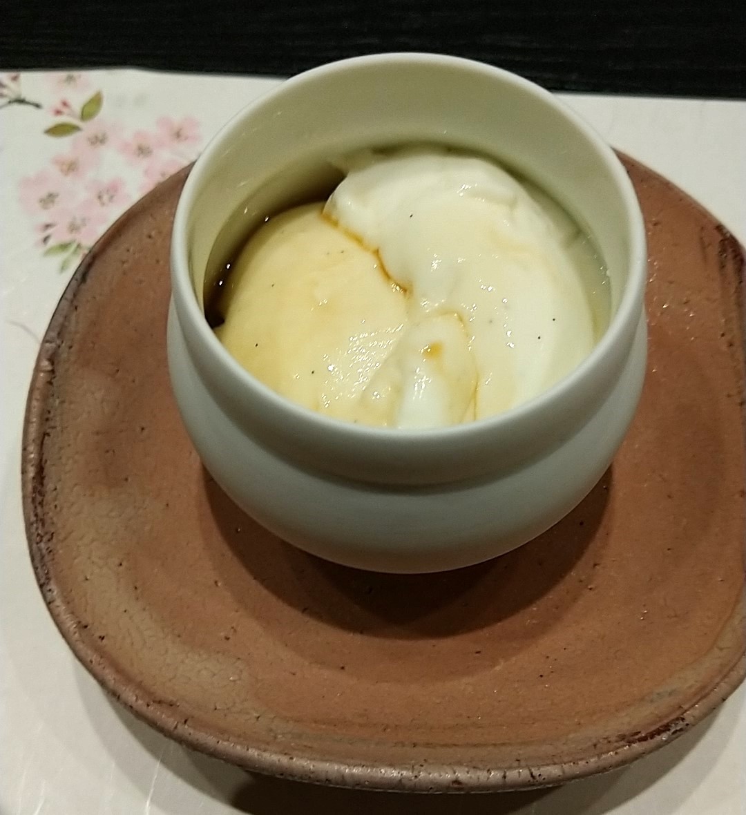 これはデザートの生姜プリン。多くの要望を受けて予約販売がされており、それがうなずけるおいしさ。香りは嗅いだ瞬間にわかるほどの強い生姜の香りが鼻を突き抜けます。ならば味わいも生姜が出てくるかと思いきや、口に入れた瞬間は生姜の香りが広がりますが、すぐにミルクの甘みが口全体に広がります。生姜の辛さは味のほうには全くなく、ミルクプリンを甘すぎないようにセーブしてくれています。そしてプリンの食感はまるでお餅のようにもっちりとしていて、葛粉が入っているのかなとおもうくらいの弾力でした。