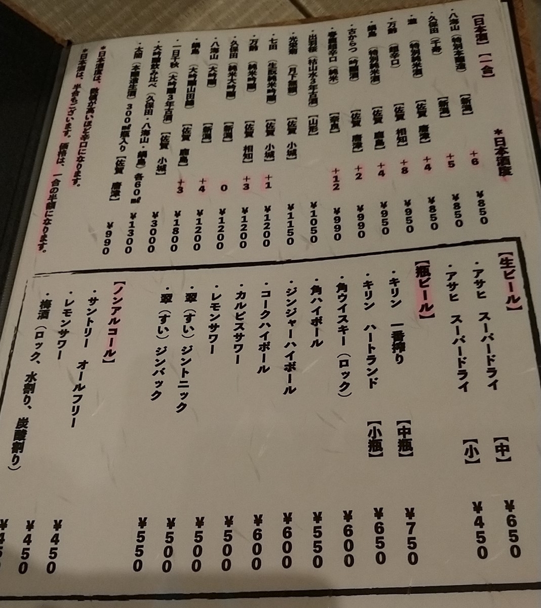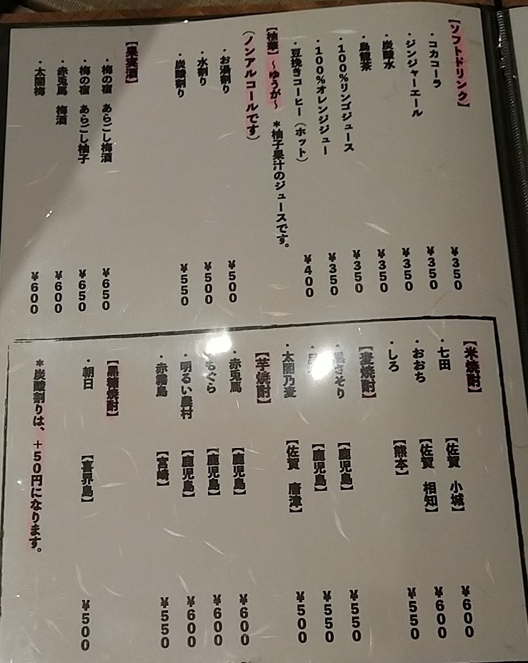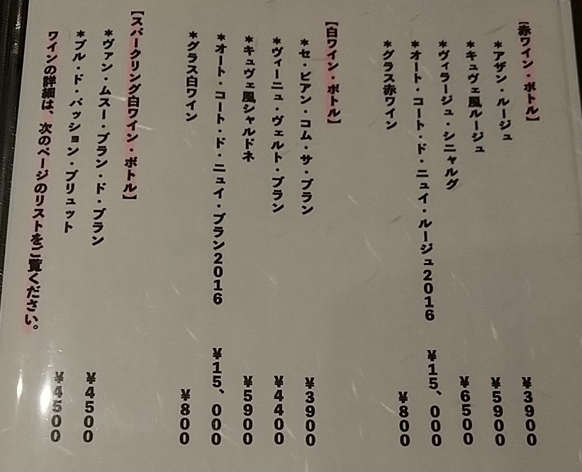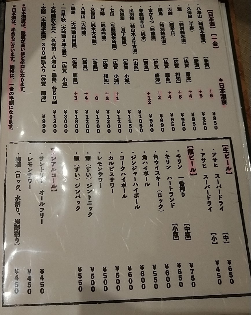 ランチ・ディナー共に完全予約制でランチコースは2450円、ランチ会席が3000円。夜のお任せ会席が3890円、季節会席が5250円の4種のみとなっています。季節懐石は月1回の頻度で新しいメニューに変わります。また3月までの期間限定でフグ懐石(11000円)もあります。このため一品料理はなく、コースメニューとお酒のみとなっています。