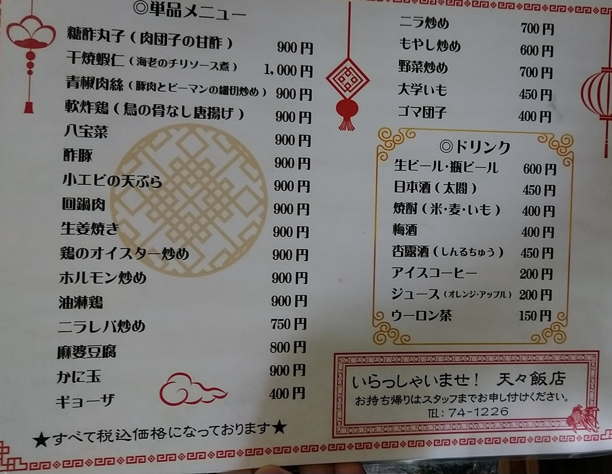 その中でも比較的入りやすく市内に位置する天々飯店はサラリーマンの利用も多く、平日でも混みあいます。店があまり大きくなく、収容人数も最大15~20名程度のため、あまり団体で利用するところでもありません。