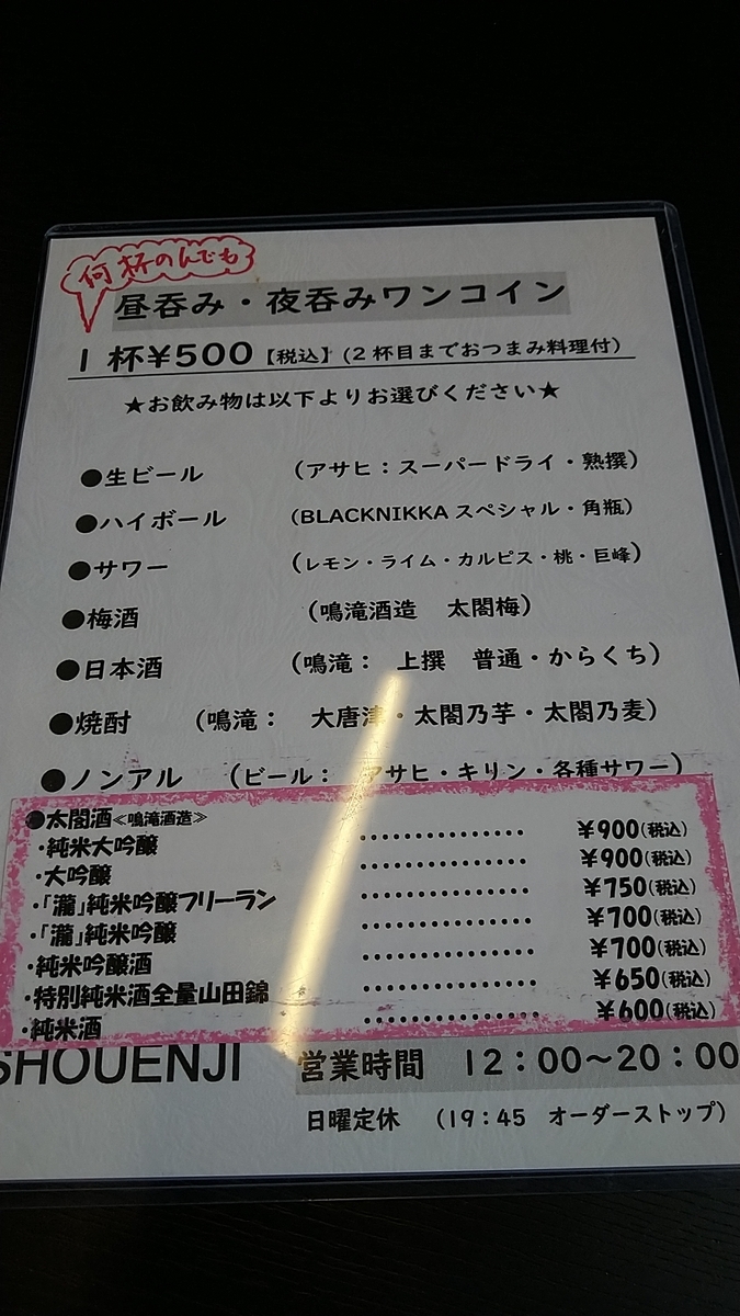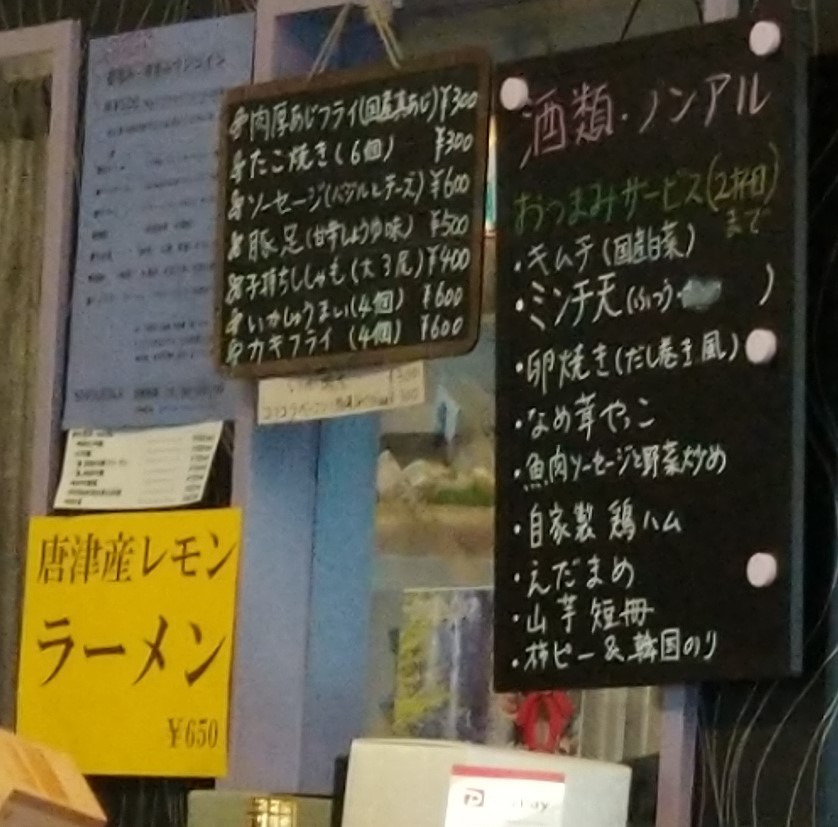 店内はカウンターが6席と四人がけのテーブルが3つ。メニューは呑み用のメニューとカフェメニューに分かれており、呑みメニューは昼・夜ともに頼めるワンコインメニュー。これはメニューのピンク枠以外の飲料が500円となっており、さらに二杯目までは好きなおつまみを一つ頼むことができます。これ以外にもミンチやカキフライ、ししゃもといった一品物を300円から注文することができます。