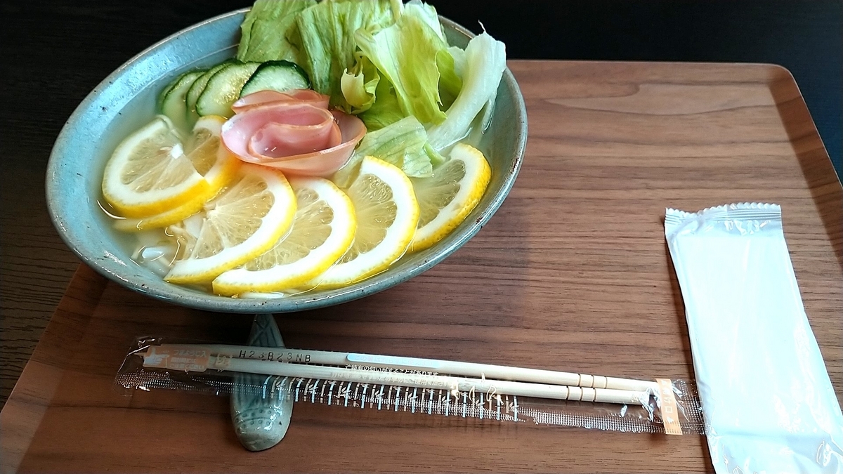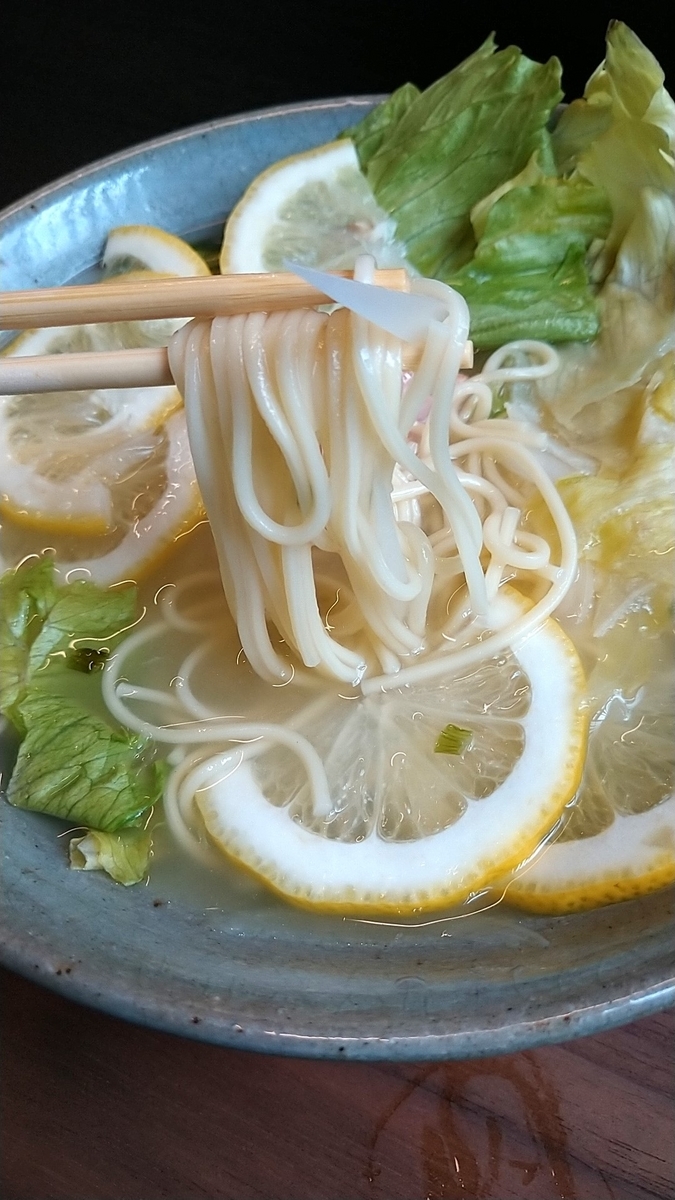 具材はレタス・たまねぎ・ハム。そしてたっぷりのレモンとさっぱりとした具材。やはり気になるのはスープから。味わってみると想像していた以上にしっかりレモン味。レモンの風味が香るくらいかと思いましたが、レモンの酸味や香りがしっかりとスープに移っており、ラーメンながら酸っぱさを感じるほどです。ベースは塩風味のためかなりさっぱりとしたラーメンとなっています。