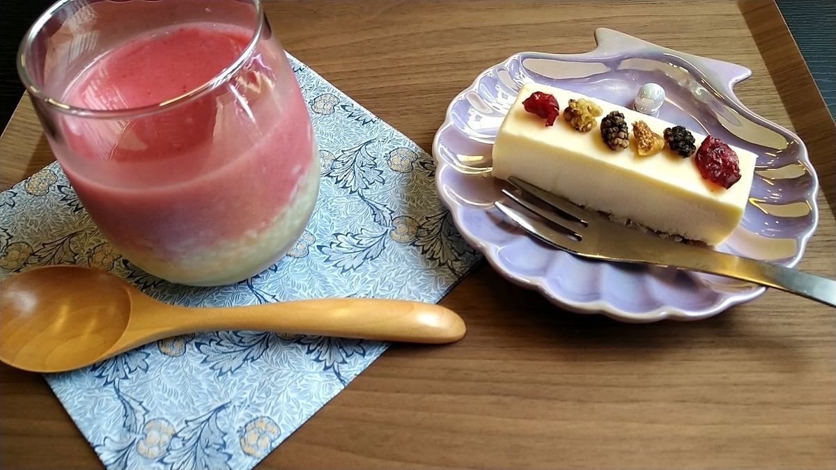 やはりカフェに来たからにはケーキとドリンクということで、ここの名物であるいちご甘酒と日替わりケーキのなかからチーズケーキを選びました。いちご甘酒は単品だと持ち帰り500円、店内飲食だと550円ですが、食事メニューと一緒に頼むと100円引きとなるため、セットで750円となっています。