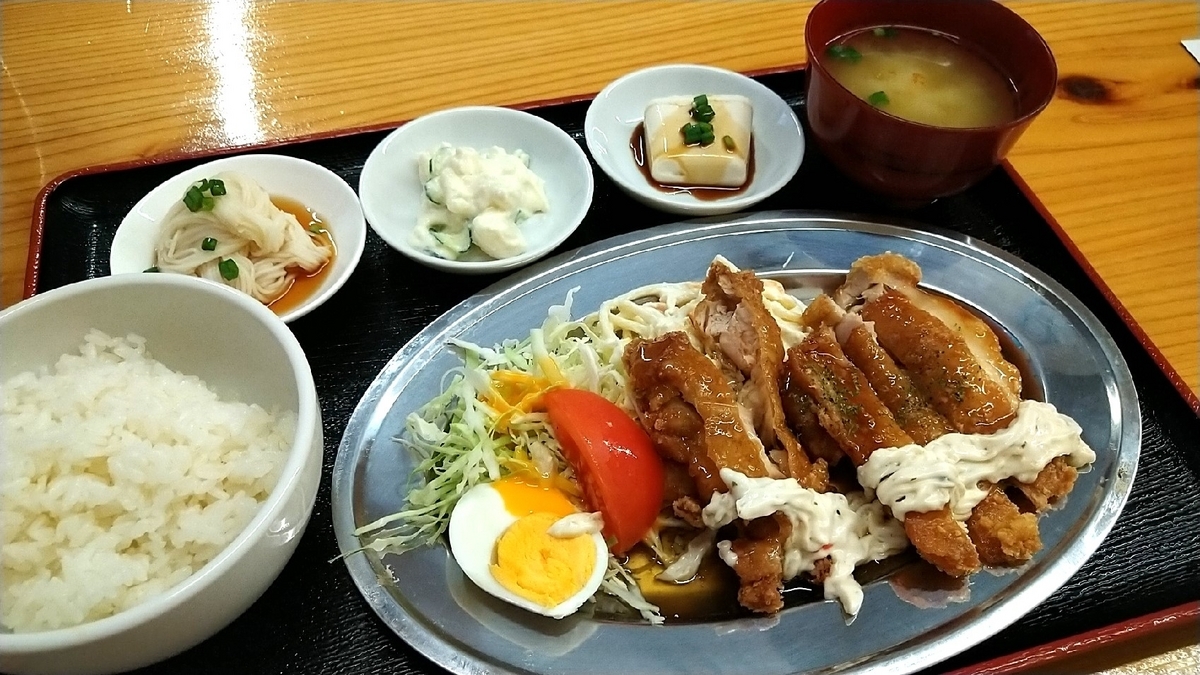 また別日にチキン南蛮定食(980円)を注文。カレーにも使われている銀のプレートにサラダとサラダパスタがあり、小鉢として冷奴とそうめん、あとポテサラがあります。南蛮頼んでこんな白い定食も珍しいな。ちなみにご飯は普通盛ですが、器のサイズがミニどんぶりくらいのサイズがあるため、ご飯の量は多めです。