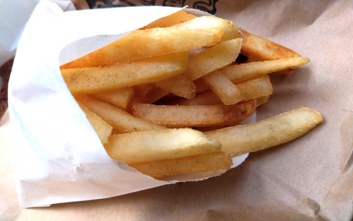 こちらがポテト。細めの一口大ポテトで味付けは塩と黒コショウというシンプルな味付けとなっています。こちらも揚げたてということもありサクサク。量としては一人で食べるにはちょっと多いかもしれないので、ハンバーガーと一緒に食べるなら二人でちょうどいいくらいです。