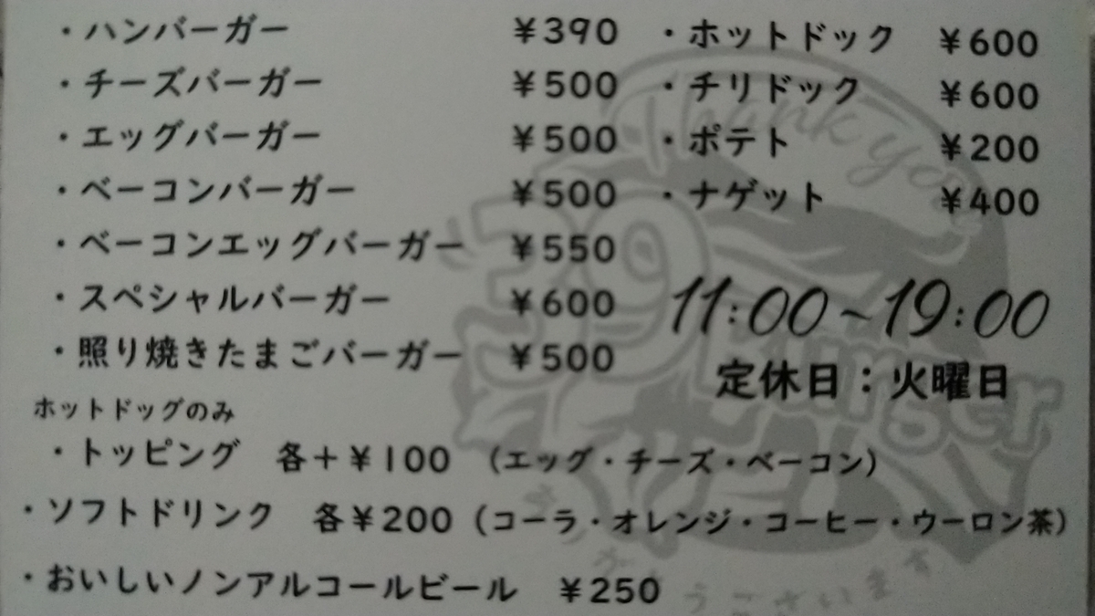 メニューはハンバーガーとホットドッグがメイン。お店の看板でもある39バーガーにちなんで、ハンバーガーは390円。それ以外はチーズ・エッグ・ベーコンバーガーが・照り焼きたまごが500円。ベーコンエッグが550円。そしてスペシャルバーガーが600円となっています。