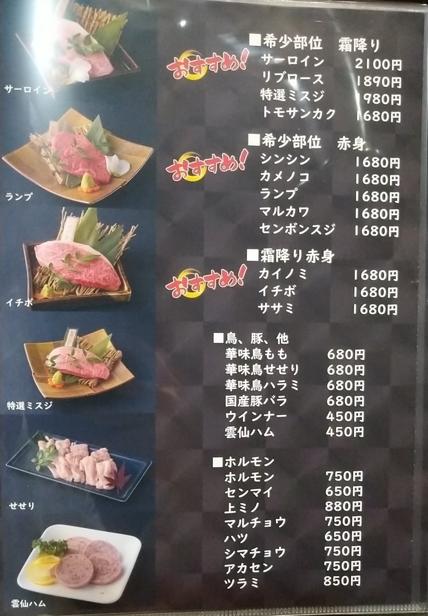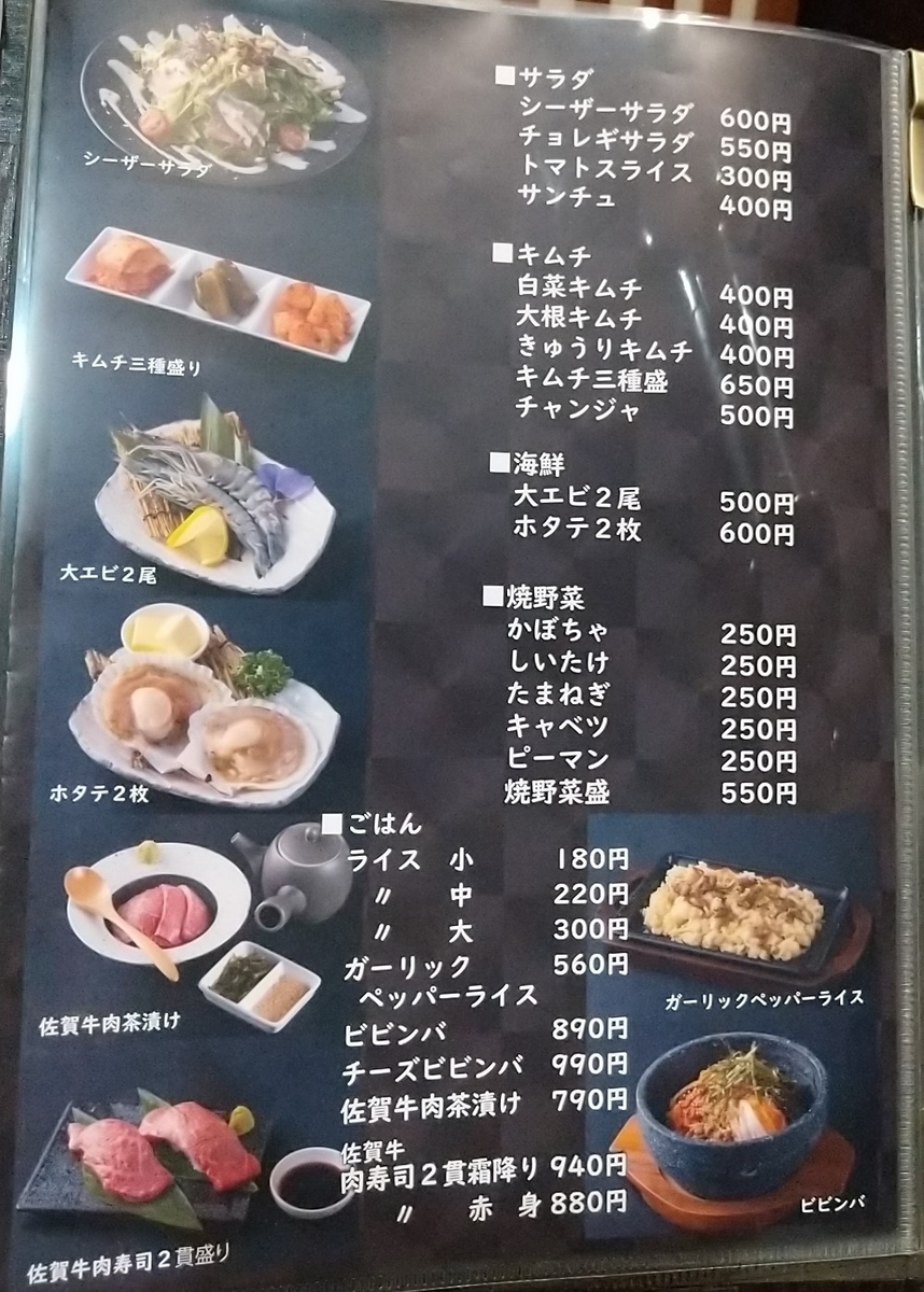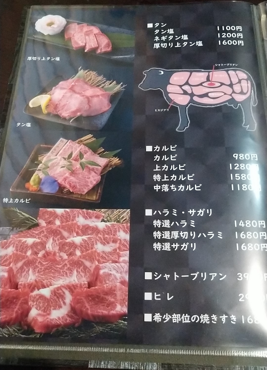 メニューは売りである佐賀牛が中心。カルビは980円から中落・上・特上と上がっていき、一番高い特上で1580円となっています。他にもタンやハラミ・サガリなどがありますが、メニューのなかで大きな割合を占めるのが希少部位。シャトーブリアンやカイノミ・ランプ・ミスジ・サンカク・カメノコなどの差しがはいった様々な希少部位が1680円から食べることができます。