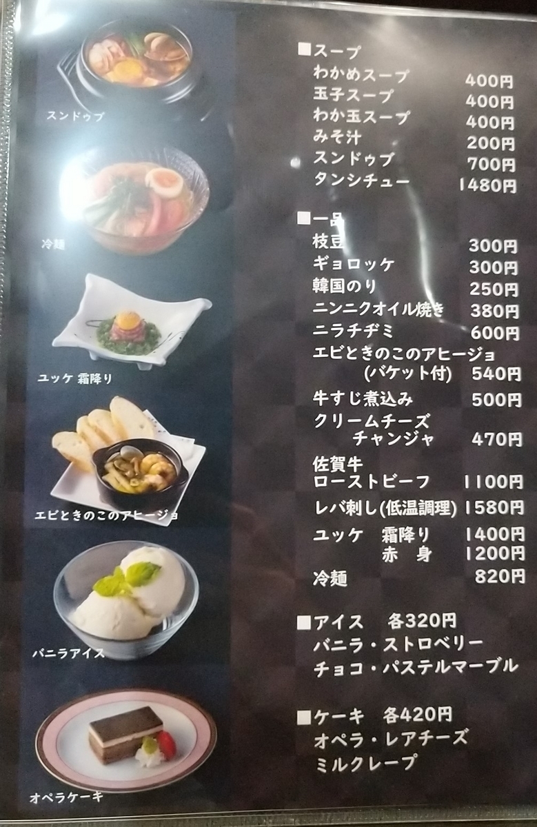 サイドメニューはサラダがチョレギ・シーザーサラダの2種類。他にはビビンバや肉寿司・ガーリックライスがあり、冷麺・チヂミなどの主食メニューや、タンシチュー、スンデゥブ、アヒージョやレバ刺しといった肉・ニンニク系のサイドメニューも豊富。全体的に女性向きのおしゃれなサイドメニューが多くなっています。