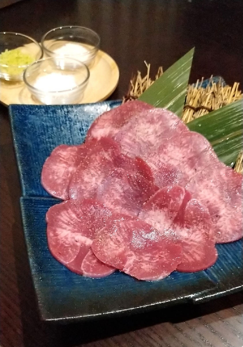 こちらはタン塩(1100円)。奥にあるのはわさび塩・粗挽き塩・岩塩です。こちらは枚数が多い代わりに一切れが他のお店のタンよりも1周りくらい小さいです。そのため女性でも一口でいけるサイズとなっています。