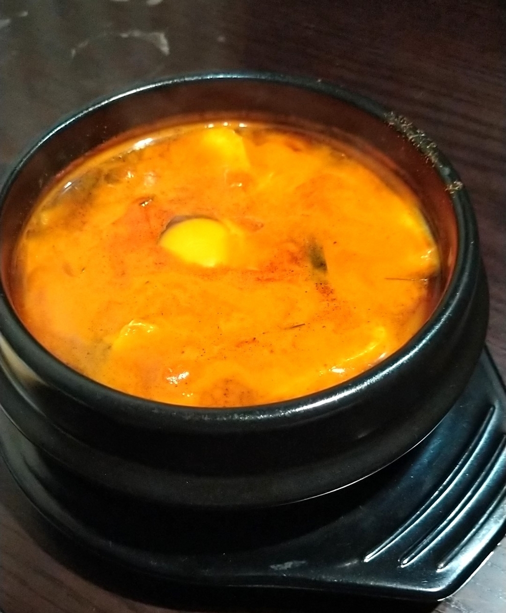 スンドゥブ(700円)。こちらですが、結構辛いのが得意!という方でないとなかなかないきつい辛さです。唐辛子がしっかりときいていて、喉にくるタイプの辛さです。これ単体で食べるより、ご飯を混ぜるとちょうどよい塩梅になるため、ご飯とセットが前提のメニューだと思います。