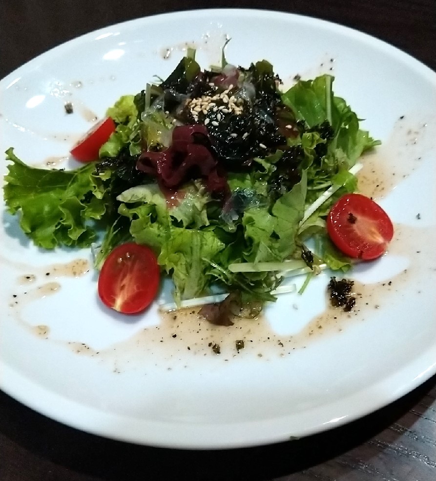 こちらはチョレギサラダ(500円)レタス・水菜・ミニトマト・海藻サラダとなっています。チョレギということで塩味が効いたドレッシングであるため、箸休めというよりもおつまみ向きかもしれません。それと量としてはぎりぎり2人前くらいなので、500円と考えると少々割高かなーと感じました。