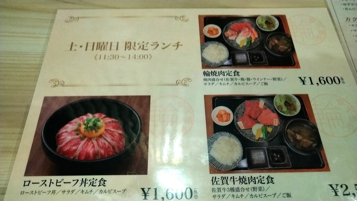 初は夜のみの営業でしたが、7月より土日限定でランチメニューの提供も開始。メニューは3種類でどれもカルビスープ・キムチ・サラダが付きます。1600円のローストビーフ丼と和牛カルビ・豚・鶏・ウインナー・焼き野菜が楽しめる輪焼肉定食。2500円の和牛3種と焼き野菜が提供される佐賀牛焼肉定食となっています。