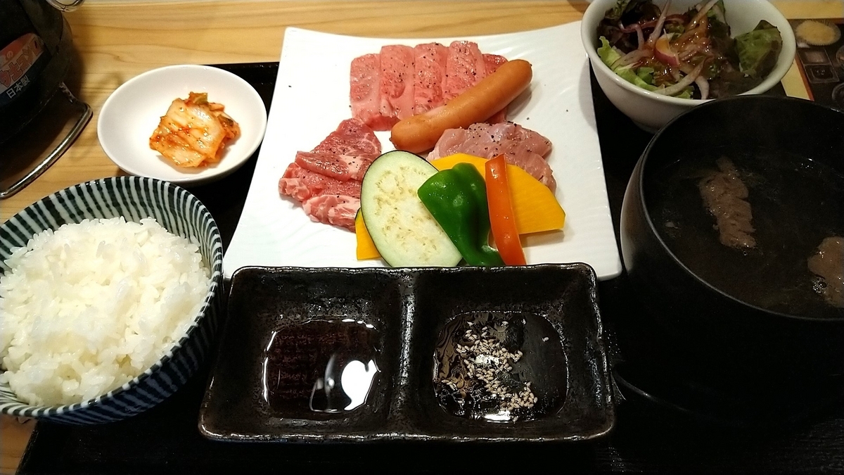 今回は輪焼肉定食(1600円)を注文。和牛カルビ・豚ロース・鶏モモ・ウインナーとなっています。