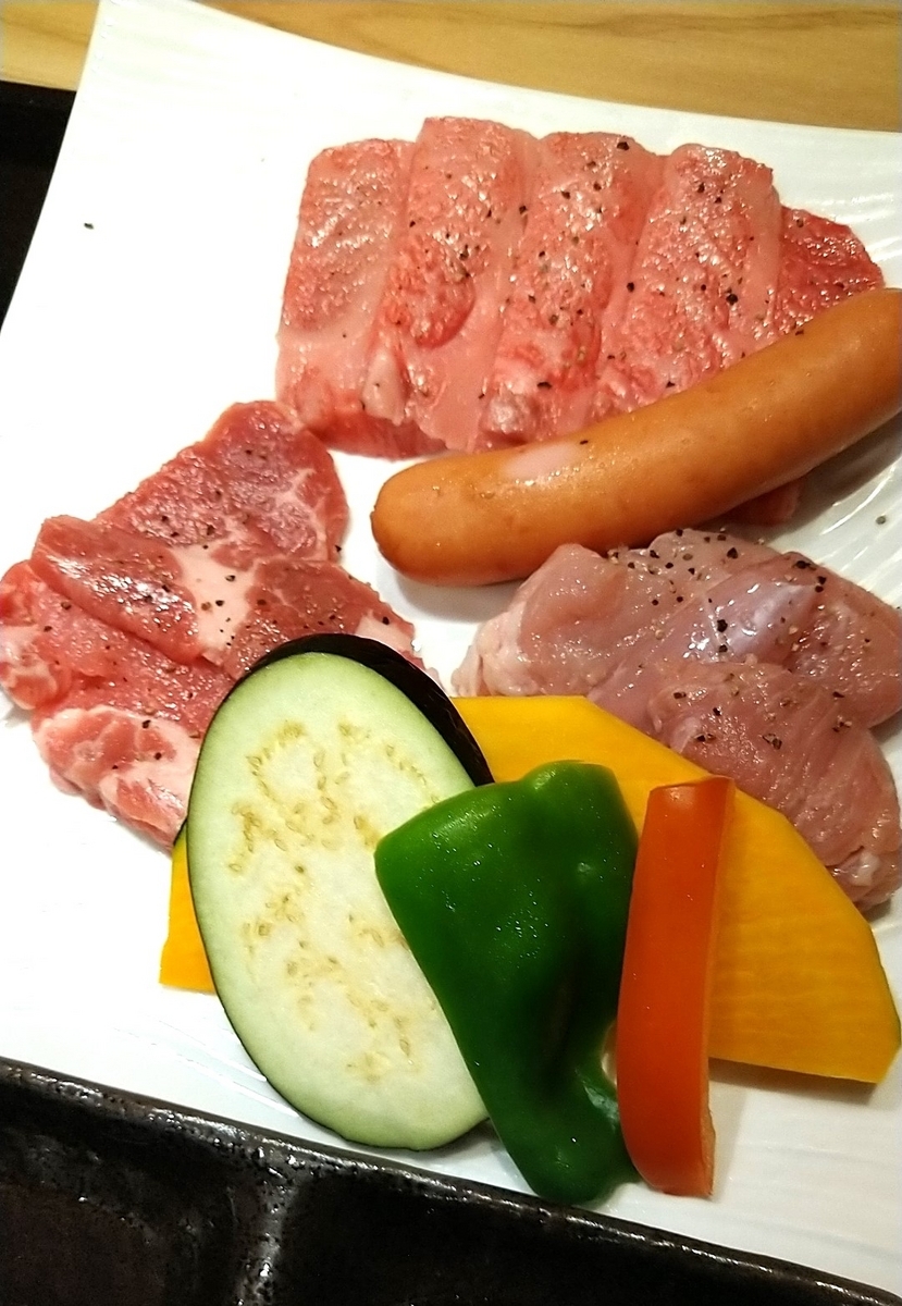 今回は輪焼肉定食(1600円)を注文。和牛カルビ・豚ロース・鶏モモ・ウインナーとなっています。