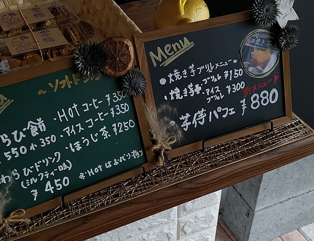 店内はカウンターが3席とテーブル席が一つ。メニューは紅はるかやシルクスイート、安納芋、からゆたかといった様々なブランド芋を焼きいもで楽しむことができます。また焼きいもだけでなく、暑い日向けに一度火を通した後で冷やす冷やし焼き芋や家でも食べれる冷凍焼きいも。大学芋などもそろえています。