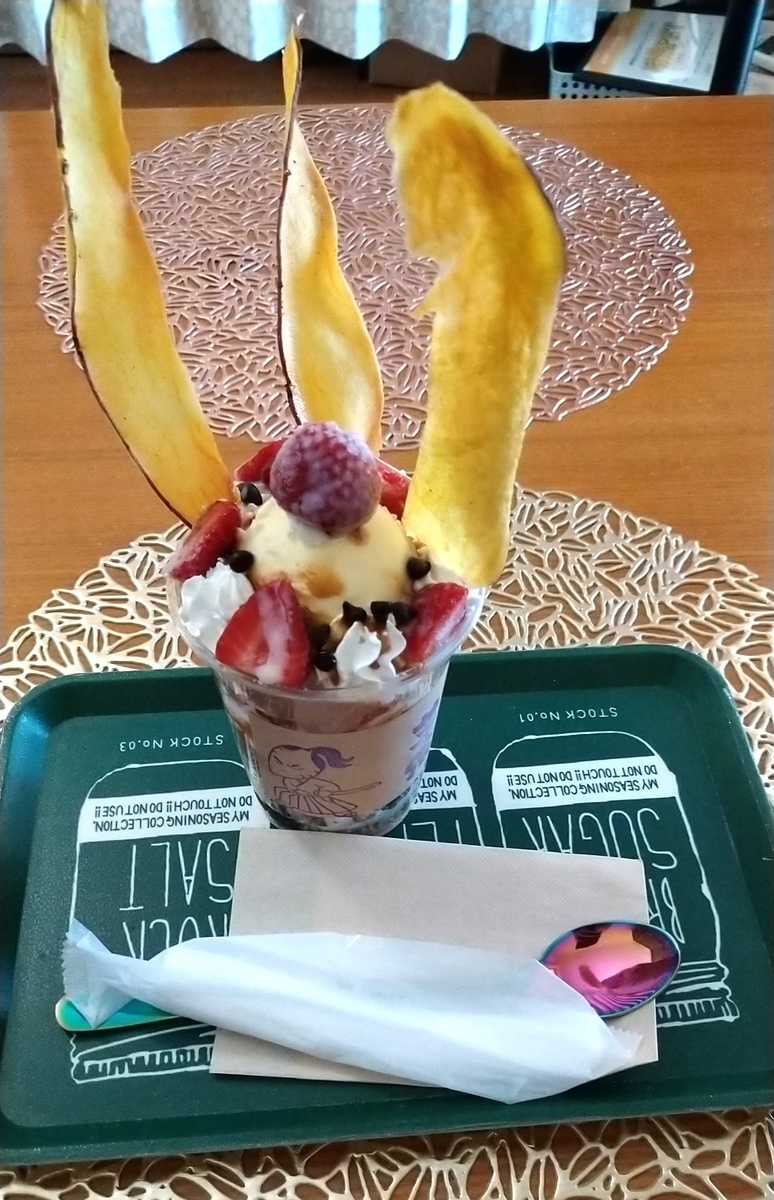 こちらは中にたっぷり入っているわらび餅。かなりもっちりしており、甘さは控えめ。しかしこのもっちり感とパフェの半分くらいを占領する量で、あれ?メインはわらび餅と思うくらいでした。