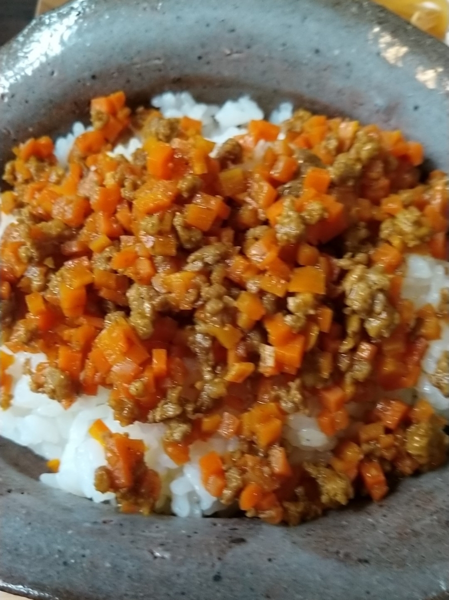 ドライカレーはひき肉とにんじんがメインのシンプルとした味付け。白米の上にドライカレーをかけたものでスパイスが効いているものン濃い味というわけではなく優しい味付け。ご飯の量は茶碗大盛よりももう少し多いくらい。お店の方がカレー風味のとりそぼろご飯と語っていた通り、カレーがしっかりきいたとりそぼろですね。