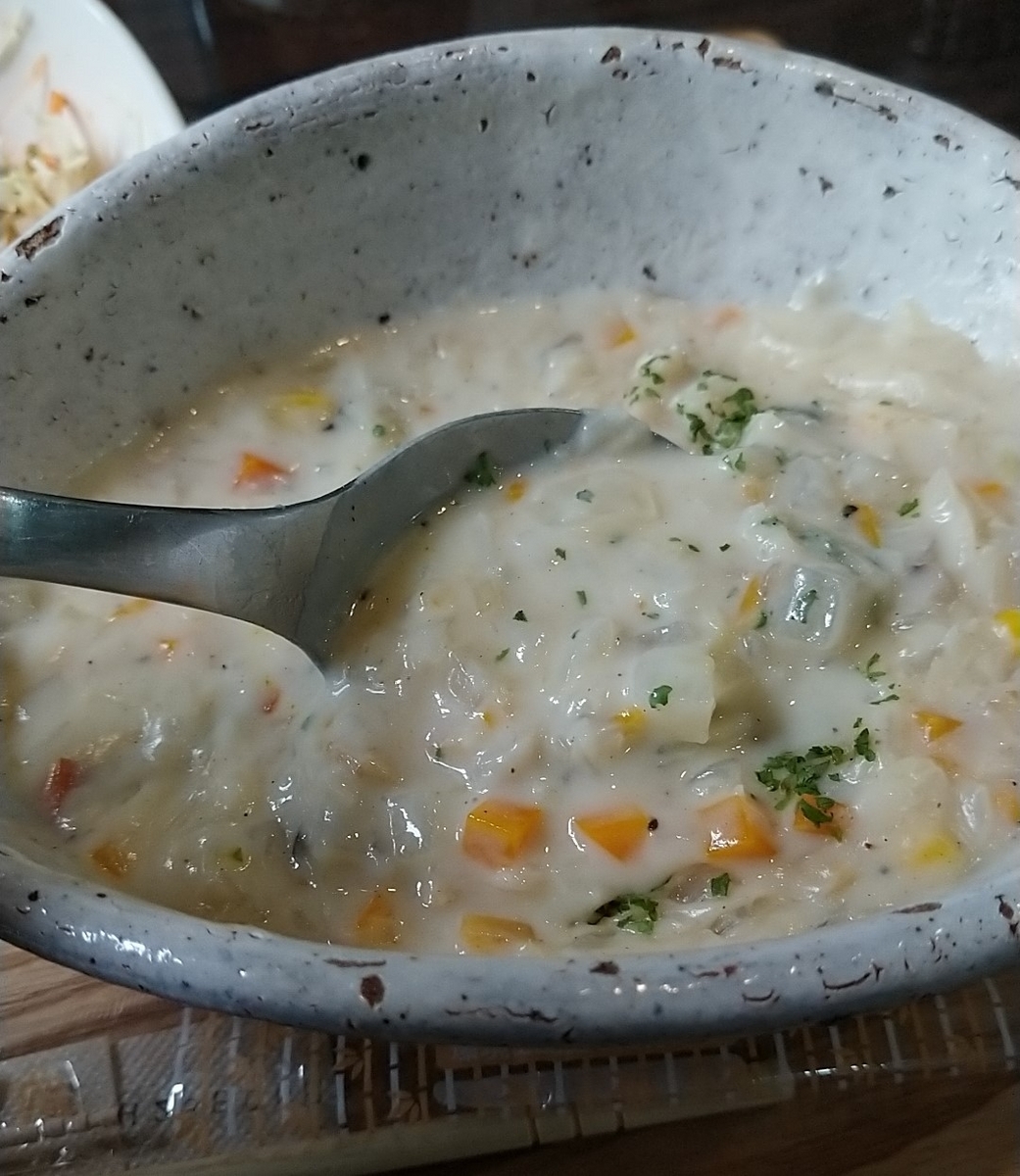 正直メインはこのシチュー。どのメニューにもセットでついてくるため自信があるメニューだとは思っていましたが、これがかなりの具沢山。どの具材も四角に細かく裁断されており、それがたっぷりと入っていて、どこをすくっても大量の具材が乗ってきます。シチュー自体もかなり固めで味もしっかりしているのでおかずシチューといった感じ。非常に食べごたえもあり、普段はシチューにご飯かけるとか無理・・・というタイプですが、これはどんどんご飯にかけて食べました。